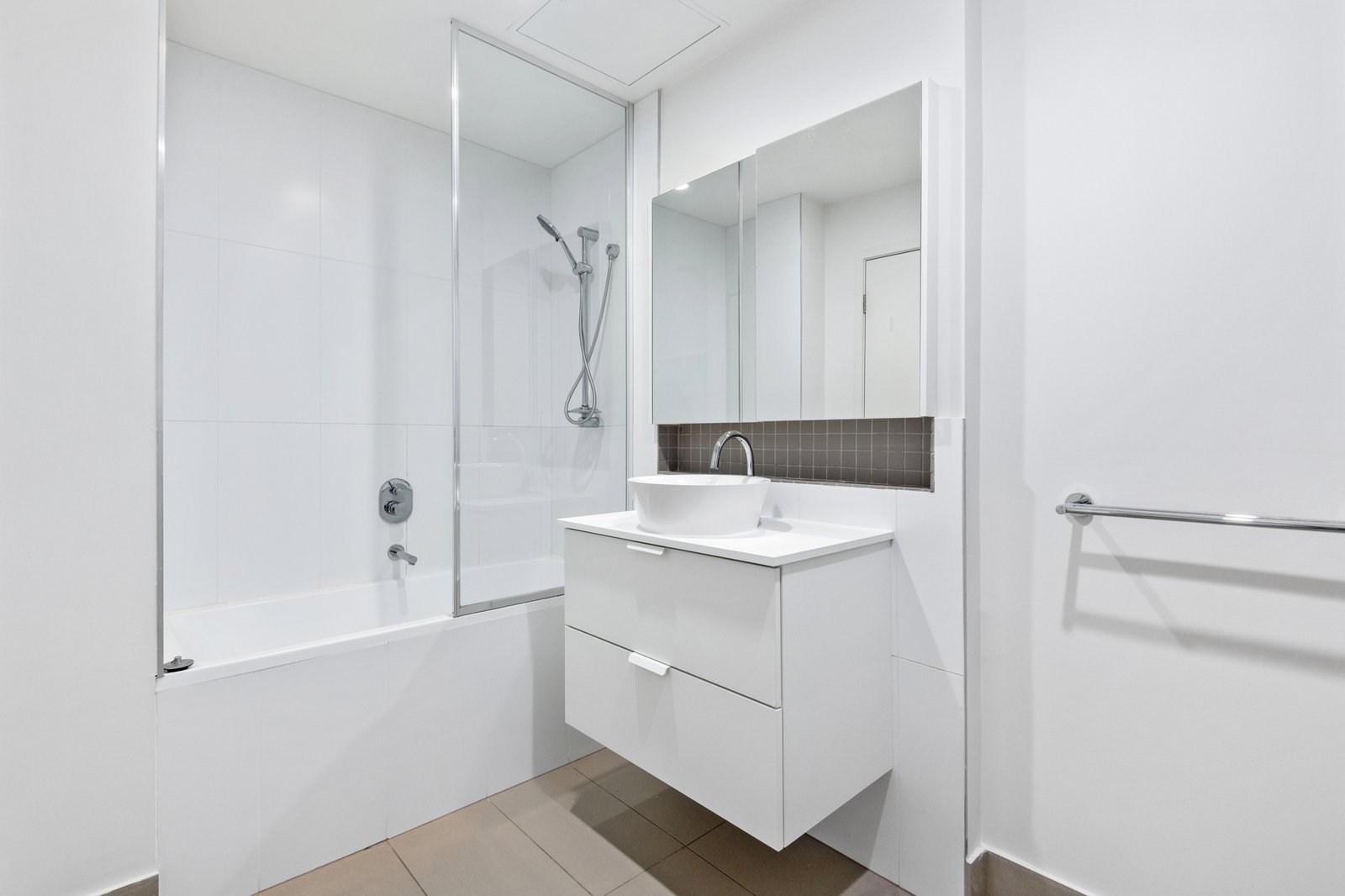 The main bathroom is well-appointed with a large bathtub, single vanity, mirrored cupboard, and additional storage, offering both functionality and style.