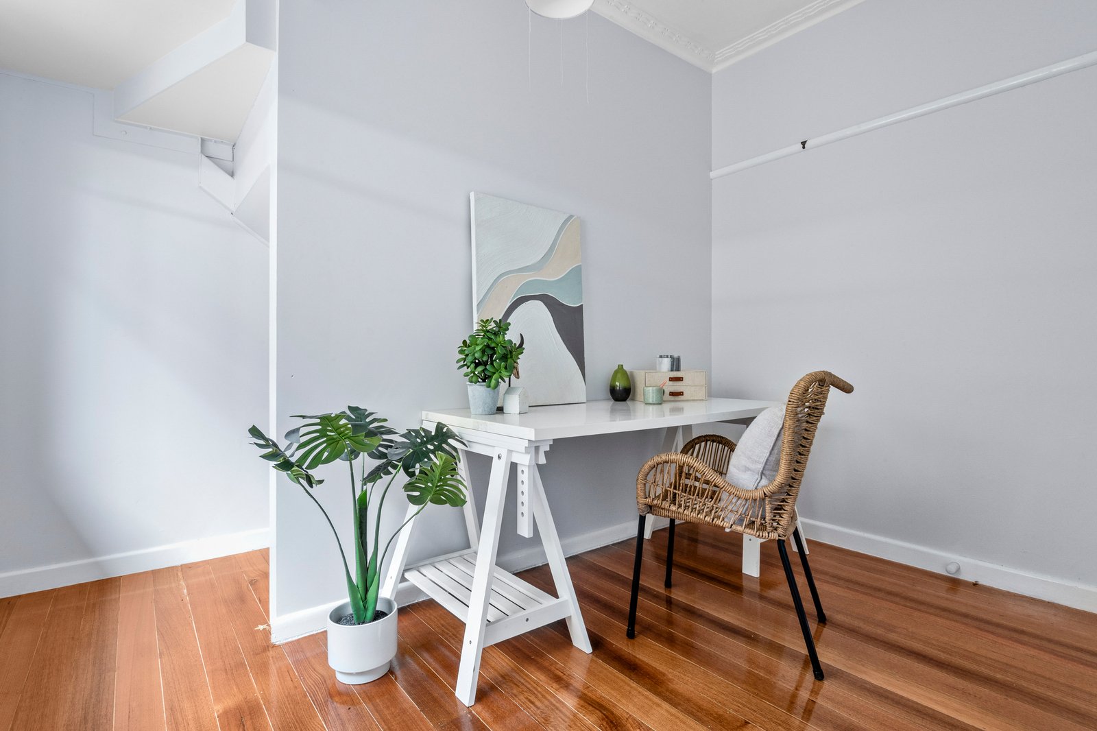 A picket fence, established gardens, and classic two-storey façade present a charming introduction to the home. Inside, a wide entry hall leads through to the light-filled living and dining area showcasing original features including polished timber floors and ornate cornice, complemented by a contemporary colour palette and split system heating and cooling for modern comfort. The adjoining kitchen is equipped with a 600mm electric oven, gas cooktop, dishwasher, elegant subway tile splashback and breakfast bar seating. The open plan layout flows into a casual meals/sitting area, which connects with the alfresco for effortless indoor-outdoor entertaining. Upstairs offers a large additional living space with elevated north facing views and direct access to the balcony, which provides the perfect space to take in the picturesque scenery.