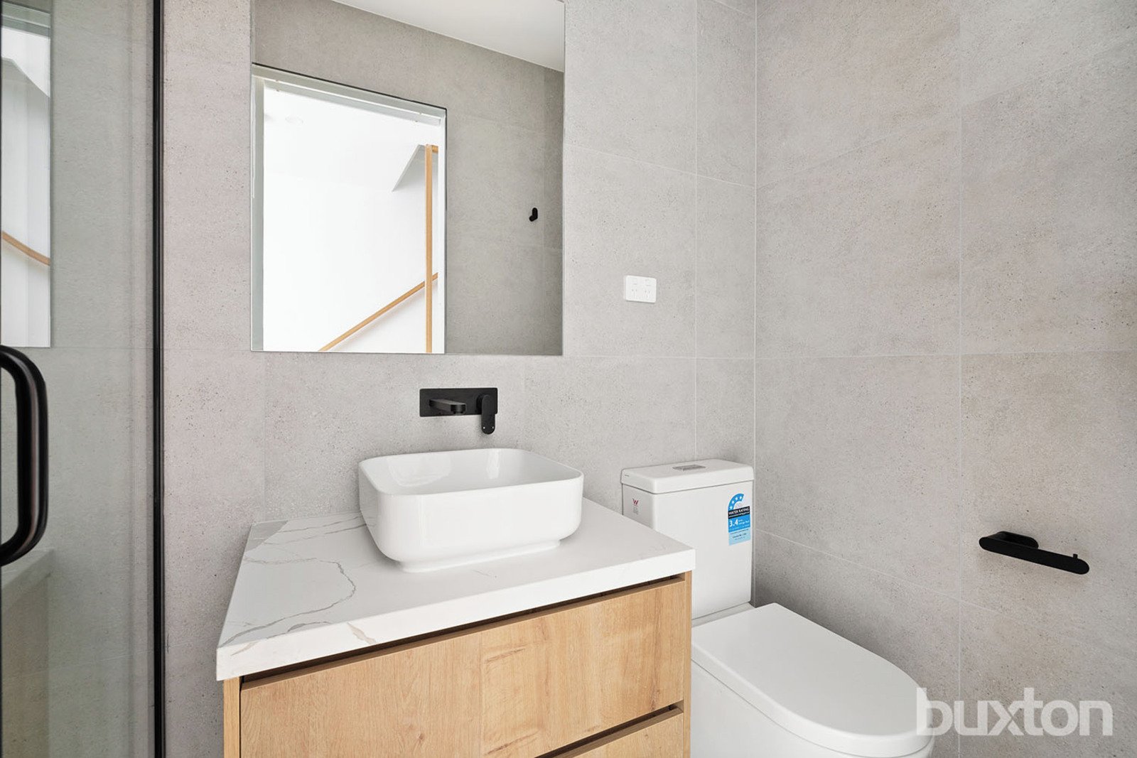 Upstairs, the top level offers three generously sized bedrooms. The master bedroom boasts its own private ensuite and walk-in robe, while the other two bedrooms feature mirrored built-in robes and share a stylish central bathroom with floor-to-ceiling tiling.