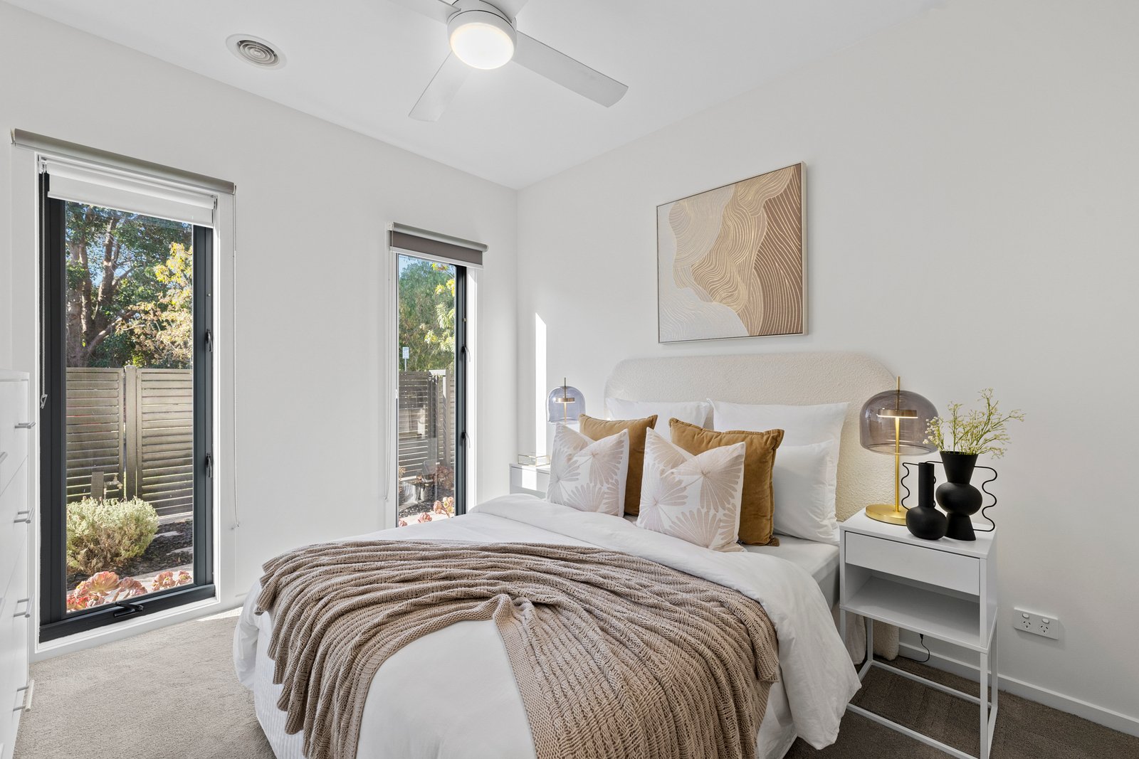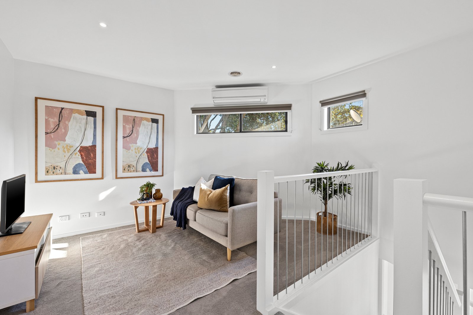 A sweeping staircase ascends to a spacious retreat, two bedrooms with mirrored robes, a sleek bathroom with bath and separate shower, and a separate WC. Privately zoned for peace and comfort, the ground-floor master bedroom features a walk-in robe and luxe ensuite.