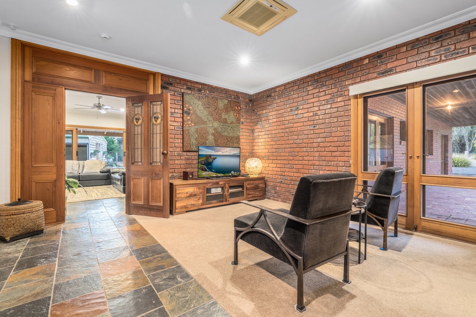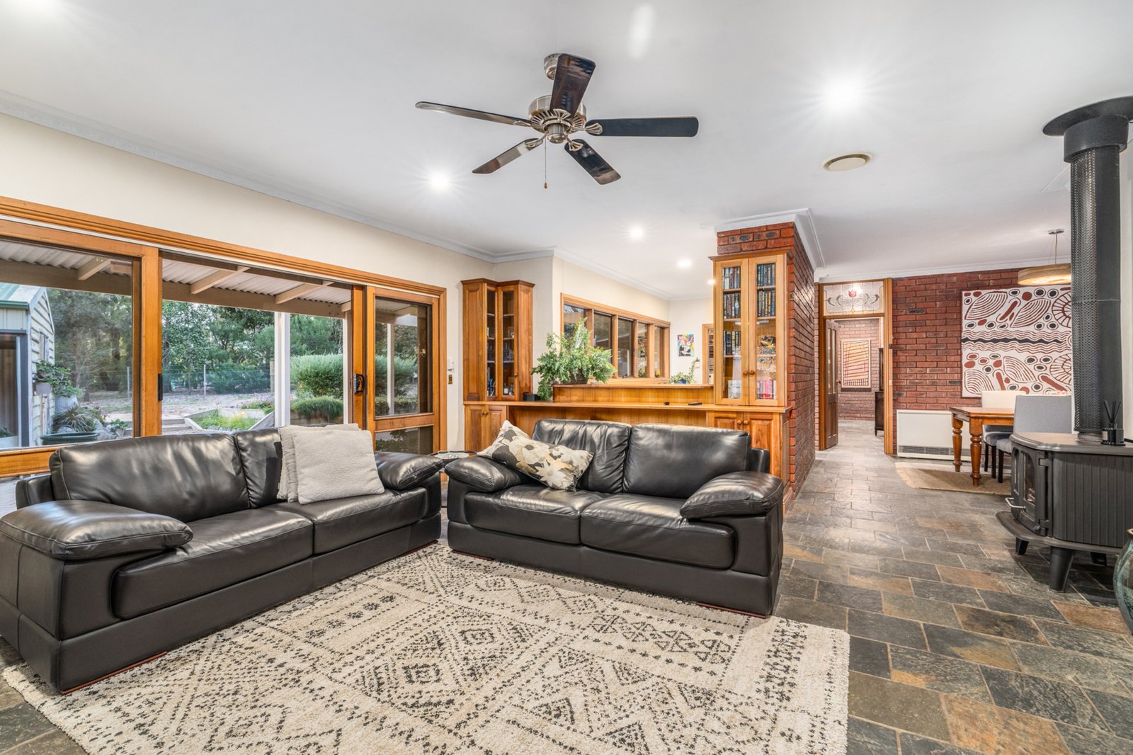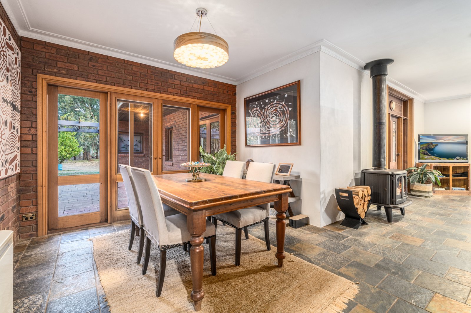 Built with sustainability in mind, this double-brick home offers excellent energy efficiency. Inside, slate floors and exposed brick walls add warmth and character, while a wood fire invites you to cozy up during the cooler months.