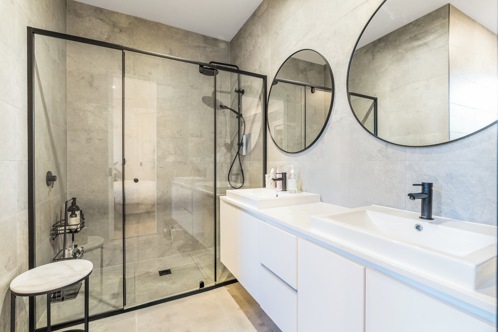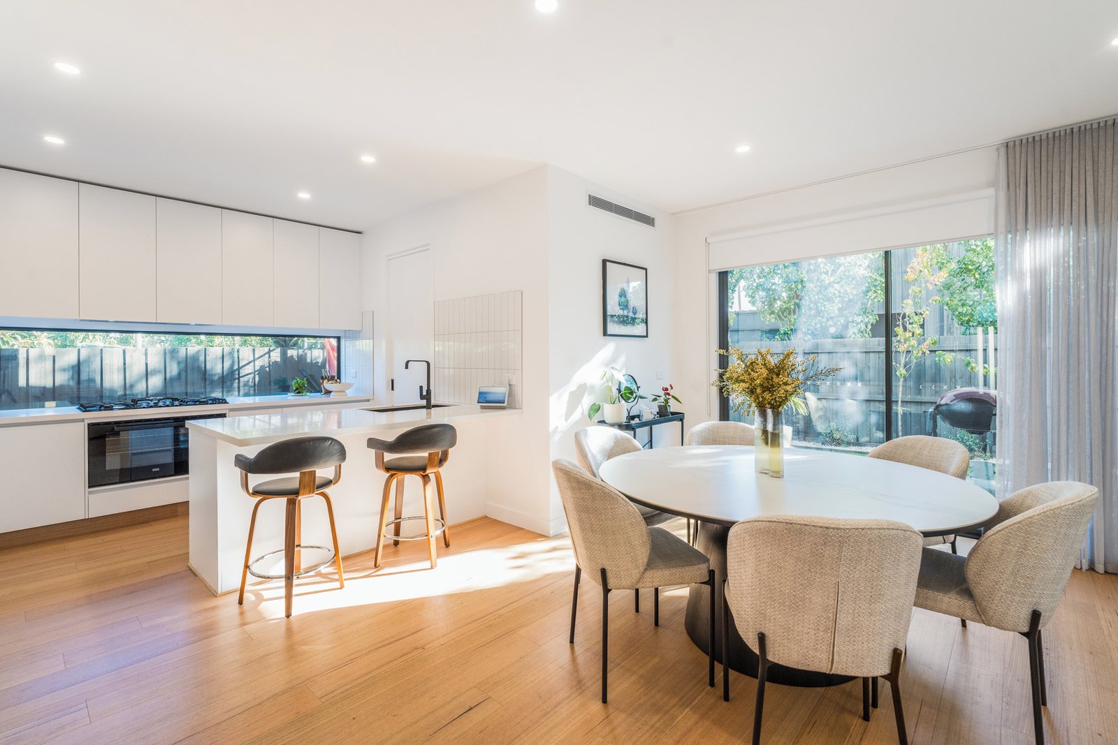 - Light-filled open-plan living with large windows and high ceilings