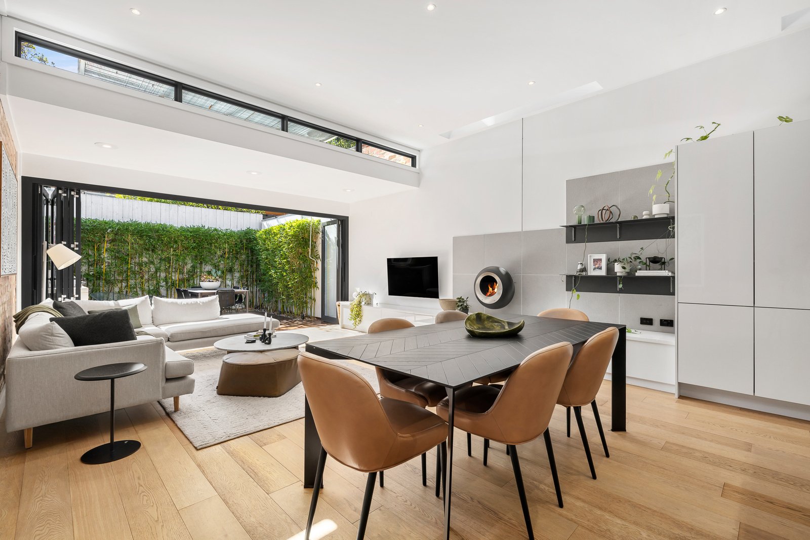 A large open plan living/dining room stretching the entire width of the block provides a fabulous domain for living or entertaining with its smart ILVE and ASKO appliances, stone kitchen, eye -catching Cocoon fireplace and bifold doors that seamlessly integrate a private northern courtyard with retractable awning, plumbed-in Grillmaster BBQ kitchen and drinks fridge.