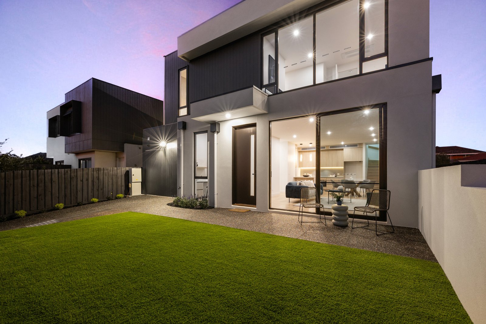 Find your way to this quiet cul-de-sac to find Bentleigh East’s biggest, newest, most breathtaking hidden treasure. With its own street frontage in a brand-new group of three, this spectacular three bedroom plus home-office, 2.5 bathroom residence makes a big bold design statement with vast living zones on each level against a backdrop of walls of double-glazing, ceilings soaring up to 3m, and luminous interiors with light oak floors, cloudy stone benchtops and tall cabinetry .