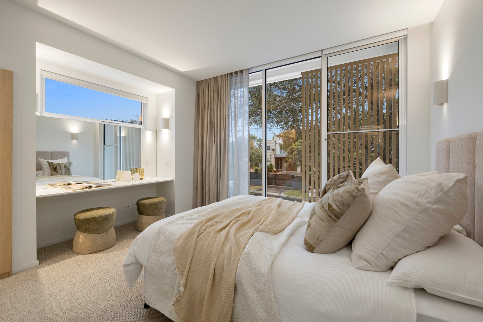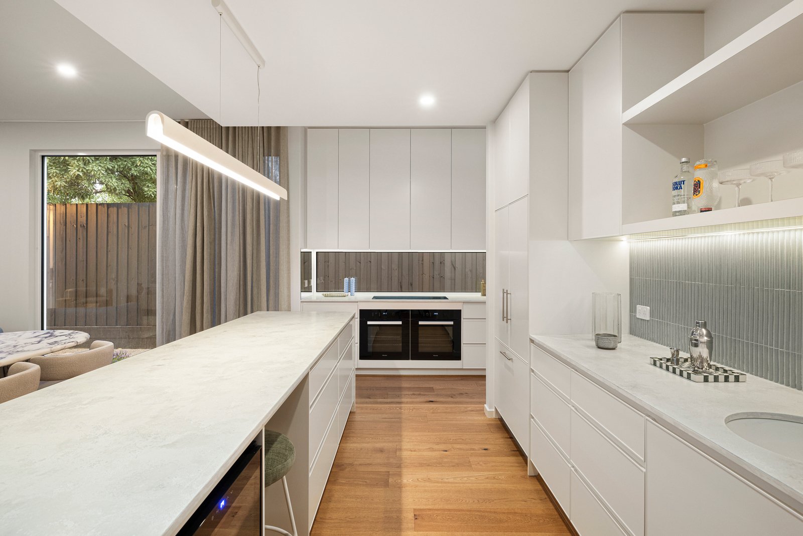 Inside, the stunning interiors by I Visualise It are enhanced by gentle muted hues and beautiful textures - all inspired by the home’s proximity to sand and sea. Crowned by soaring 3m ceilings, the accommodation itself includes an open plan living/dining zone where a stunning kitchen simply commands attention with its Lavistone benchtops, premium Miele appliances, an integrated fridge/freezer, wine fridge and gorgeous 3D finger-tiled splash back.