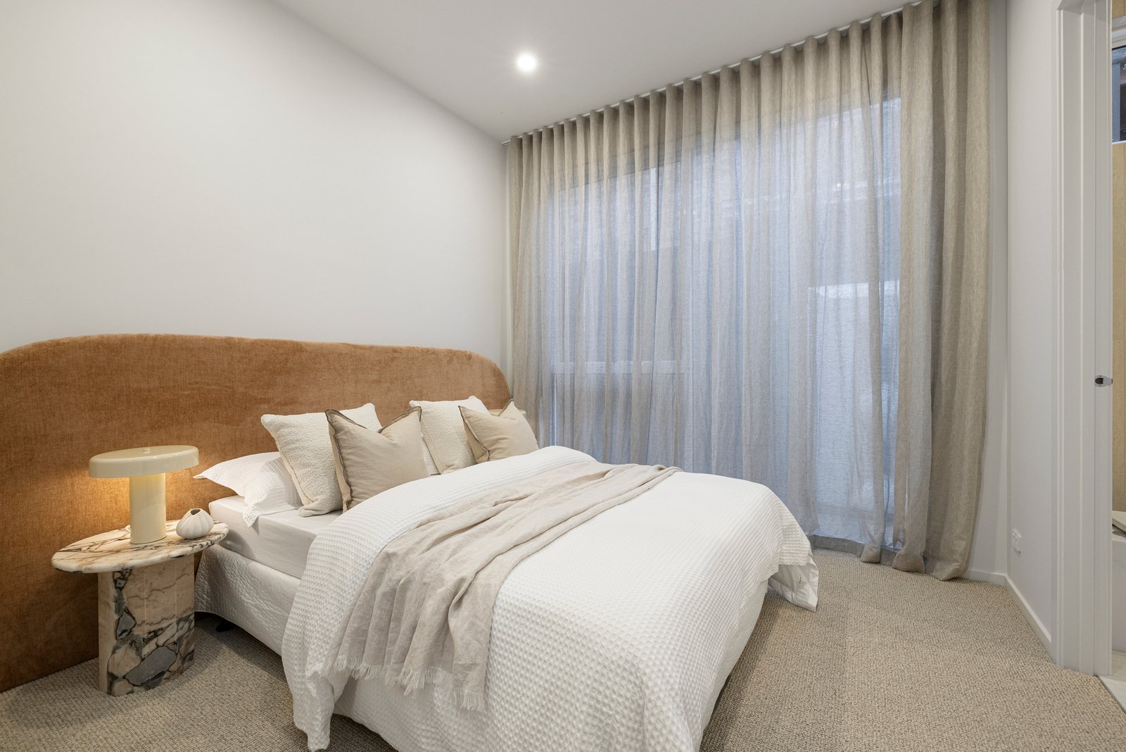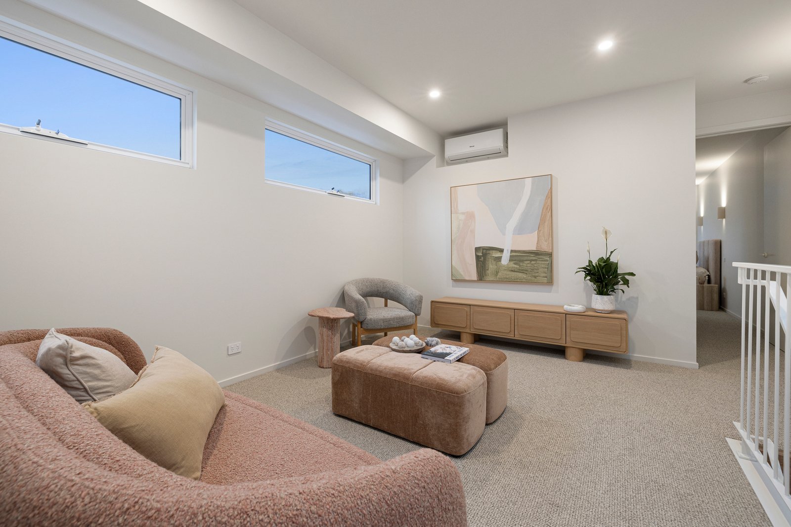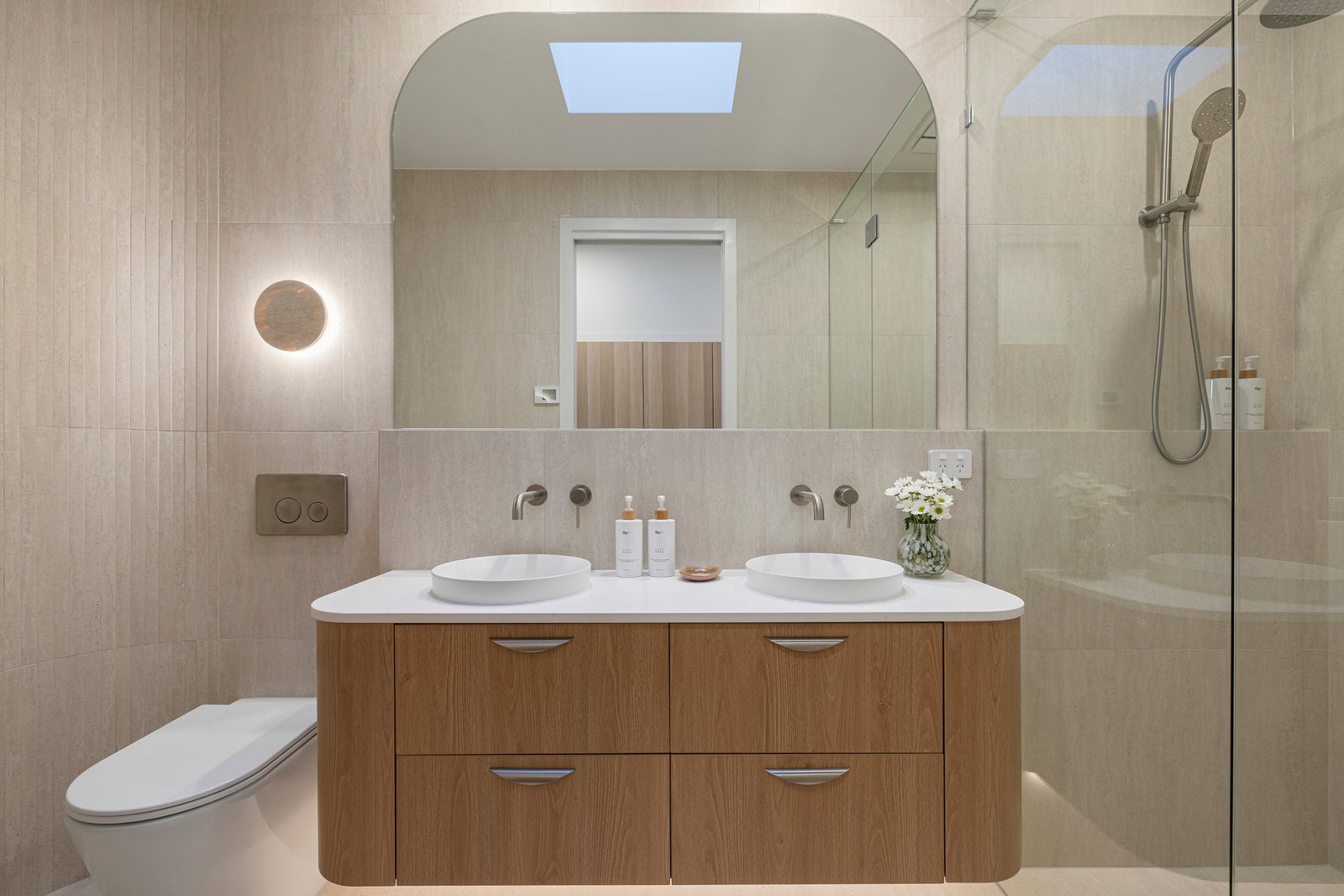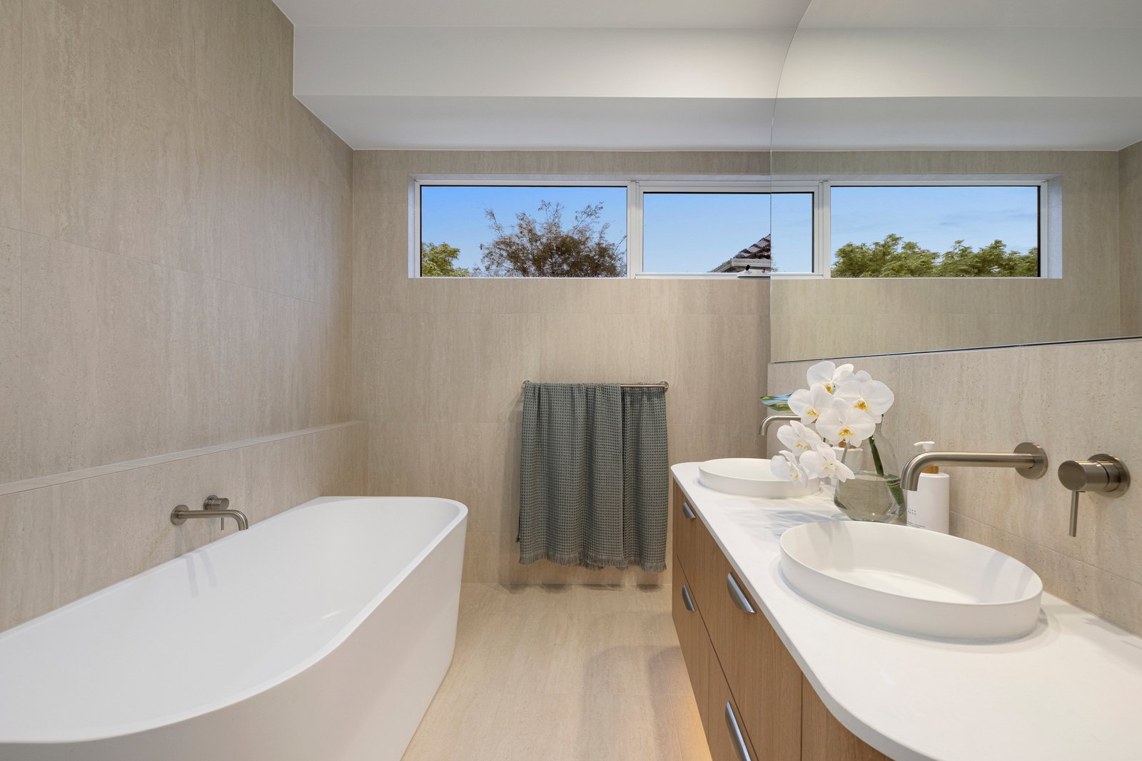 Engineered floors, premium wool carpets, a powder room with statement Nood Co basin and full laundry with extensive storage are all offered, along with multiple split systems (all principal rooms), in-floor bathroom heating, brushed nickel fixtures, linen sheers and block out roller blinds, BBQ and double auto garage with house access. High-end designer-specified travertine tiles feature throughout - including travertine crazy paving – adding sophistication and luxury to every space.
