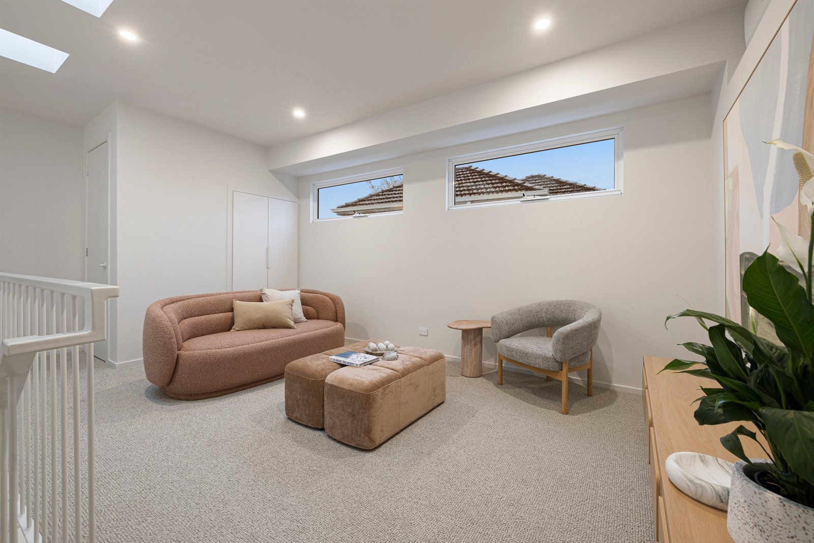 A ground floor bedroom with ensuite is among the crowd-pleasing inclusions, while both a lift and floating staircase lead to the home’s first floor which is bathed in natural sunlight thanks to multiple skylights. Here, a genuine lounge provides even more valuable living space while the street-view primary suite impresses with custom wardrobing and a magazine-worthy ensuite. An equally stylish family bathroom is also offered and services the remaining bedrooms, both with built-in robes.