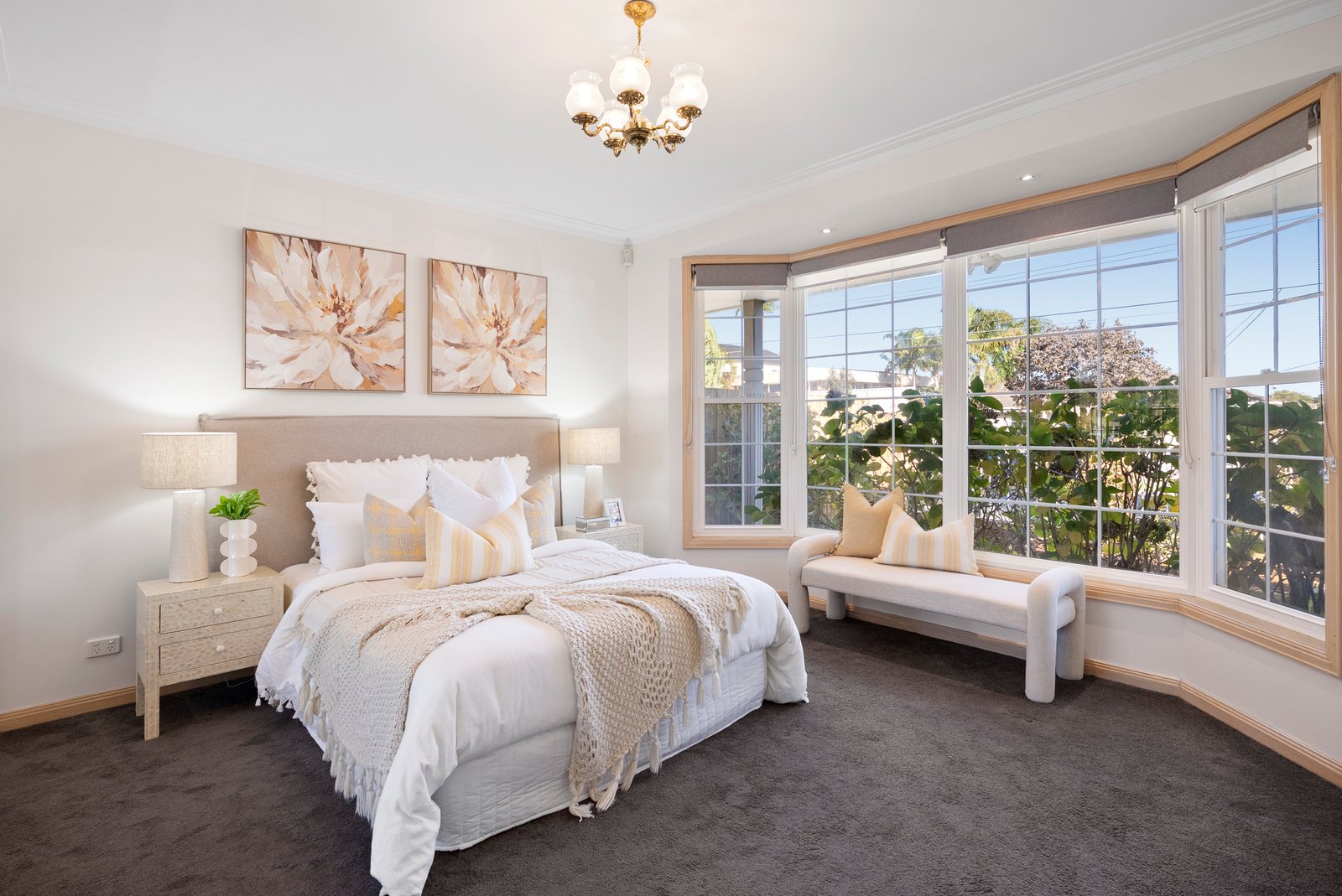 A masterful combination of space and light dominate the free-flowing floorplan with a superb formal living with open fireplace and glorious bay window overlooking the leafy front gardens, sitting alongside an elegant dining room.
