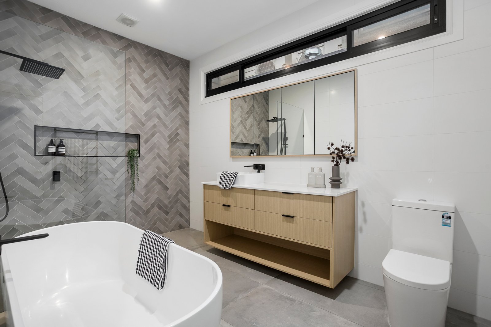 Four generously sized bedrooms form a perfect family sanctuary, including a sophisticated master retreat with plantation shutters, built-in robes, and designer pendant lighting, alongside a luxurious walk-in robe with bespoke storage. The show-stopping ensuite features a concealed sliding door, floor-to-ceiling tiling, premium black tapware, and a rainfall shower with niche shelving. The family bathroom is equally impressive, boasting a freestanding statement bath, dual rainfall shower heads, custom vanity, floor-to-ceiling tiling and designer feature tiling.