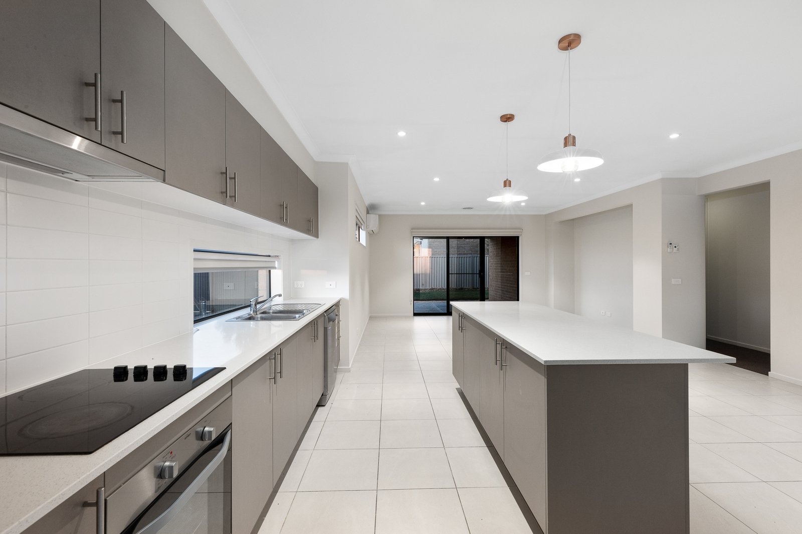 Step inside and be welcomed by a spacious open-plan living, kitchen, and dining zone – the heart of the home – where natural light, high ceilings, and quality finishes create a warm and inviting space for family life and entertaining. The large kitchen is a chef’s dream, boasting stone benchtops, 600mm electric appliances, a dishwasher, an oversized walk-in pantry, and generous cupboard and bench space, all designed to cater to modern family needs. The adjoining meals and living area is complemented by a TV nook and split system cooling for year-round comfort.