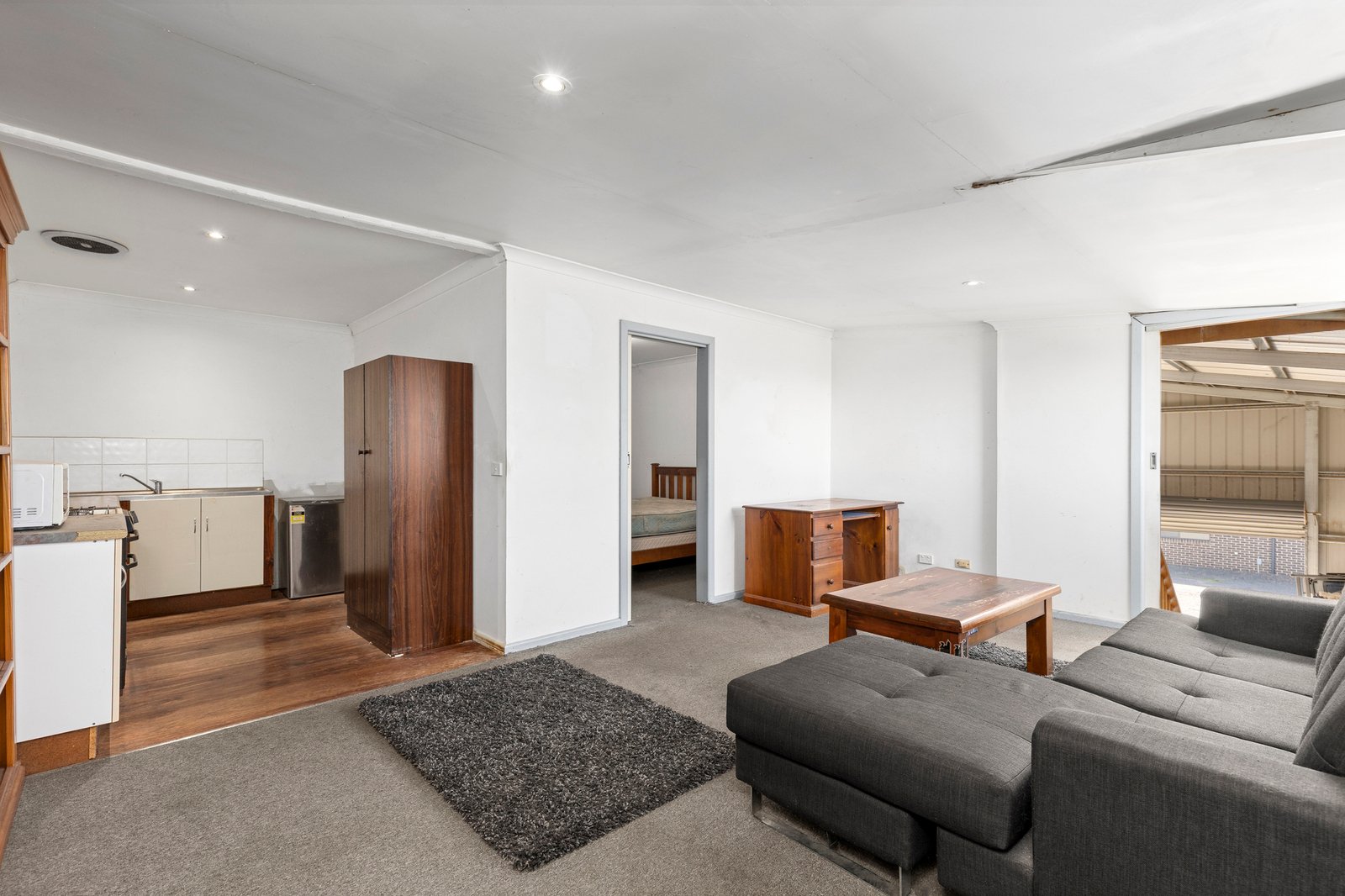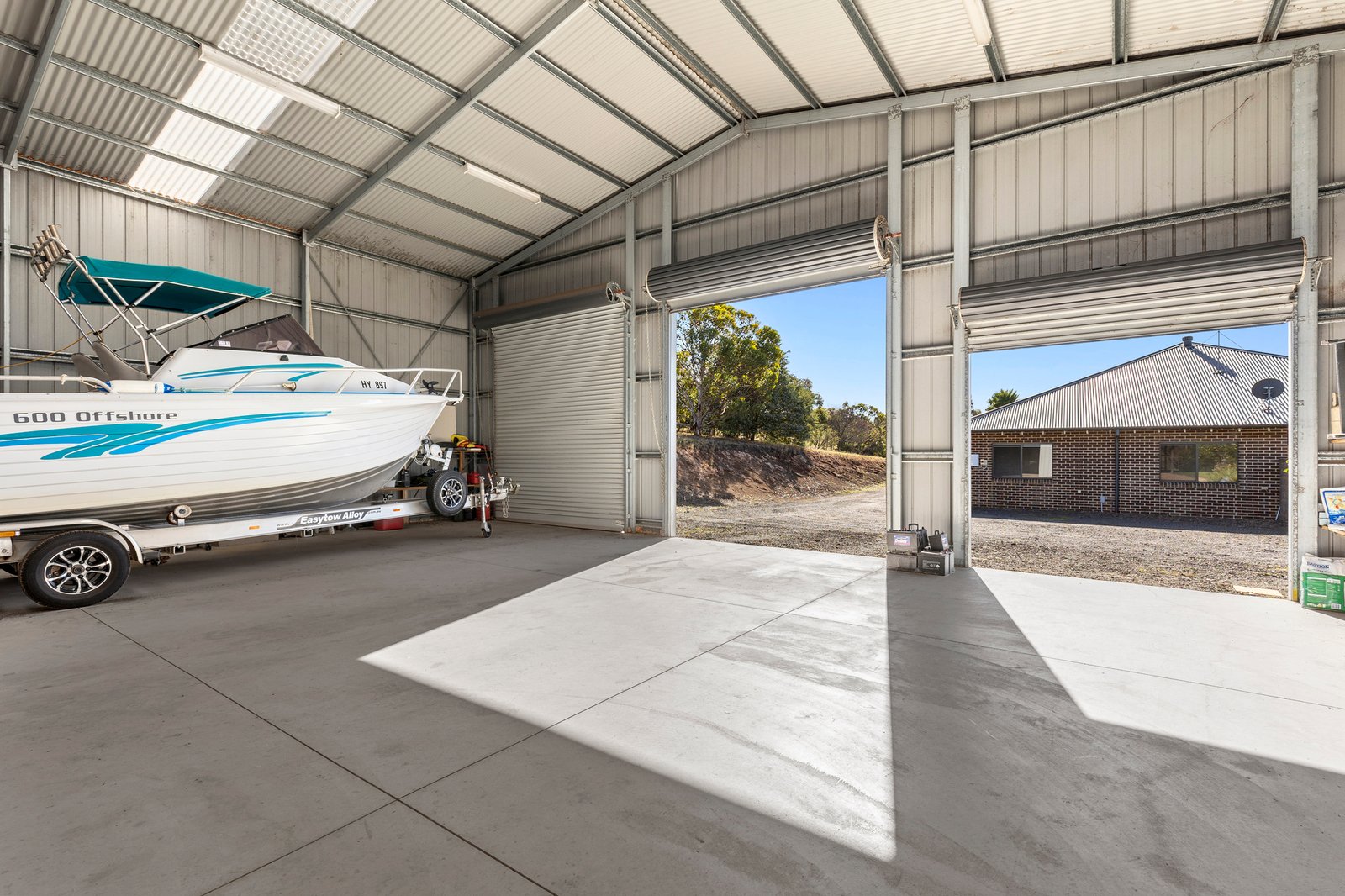 A huge six-car garage includes high clearance roller doors (3.5m approx.) and 6m pitch roof, workshop facilities, and a woodfire heater. The mezzanine unit within the garage is designed for self-contained living, with kitchenette, separate bedroom with built-in robes, two sitting areas, split system heating and cooling, bathroom and laundry facilities. The property also includes a 5kW solar system for energy efficiency, and two water tanks totalling 45,000 litres.