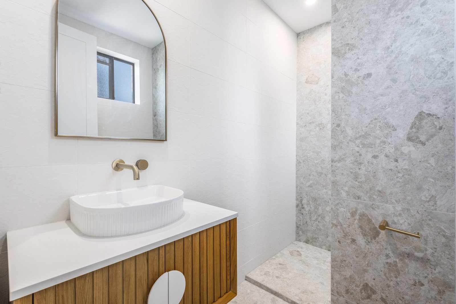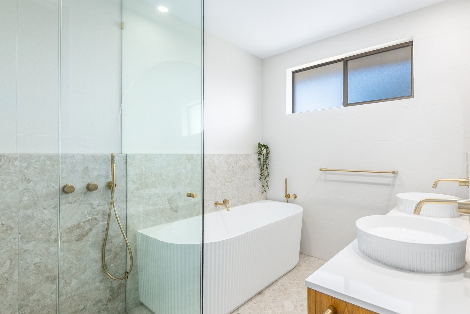 Both bathrooms are beautifully appointed, with the main bathroom showcasing a stunning freestanding fluted bath, a floor-to-ceiling frameless glass shower, a double vanity, and elegant brass tapware. The second bathroom on the ground floor continues the high-quality finishes with floor-to-ceiling tiles, a walk-in shower, and a modern vanity with a stone benchtop.