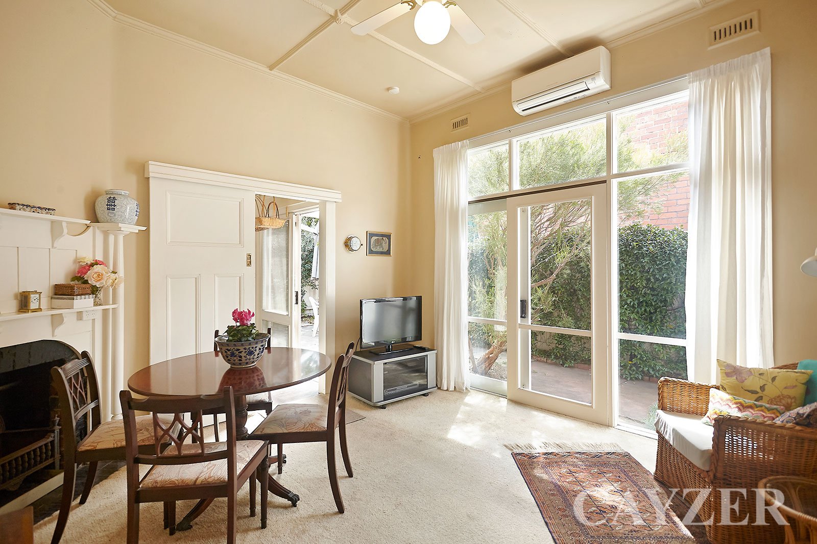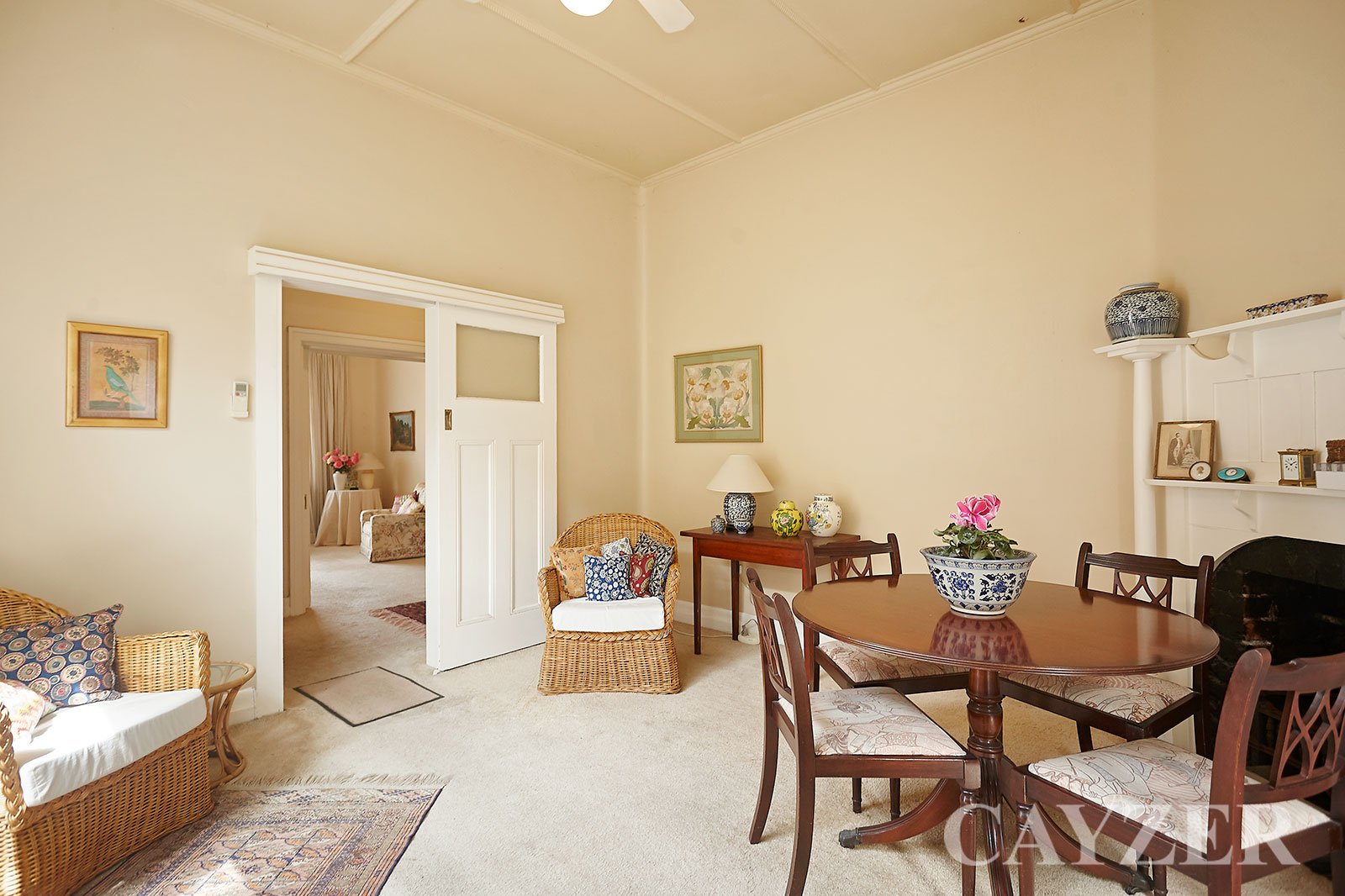 Comprising: Wide hallway entrance, character filled and spacious front lounge/bedroom, two further excellent double bedrooms (built-in robes), study with cellar and bathroom. Light-filled formal dining/sitting room (open fireplace) which leads to kitchen/meals area and north-facing paved courtyard.