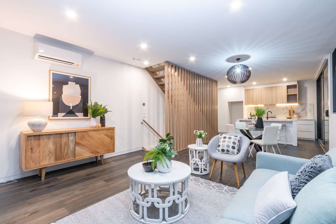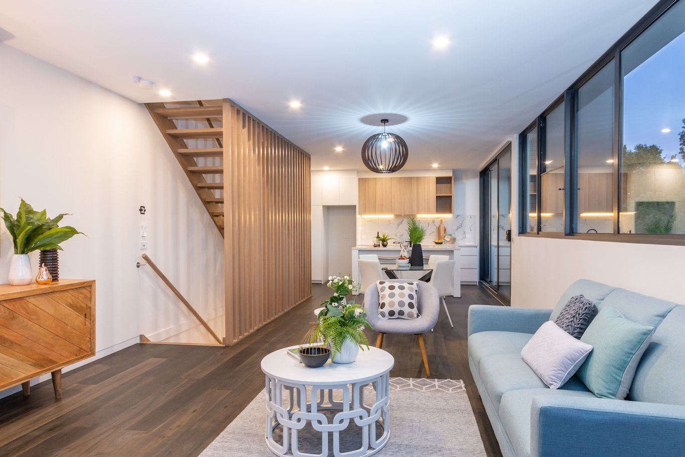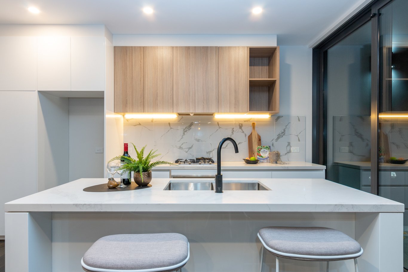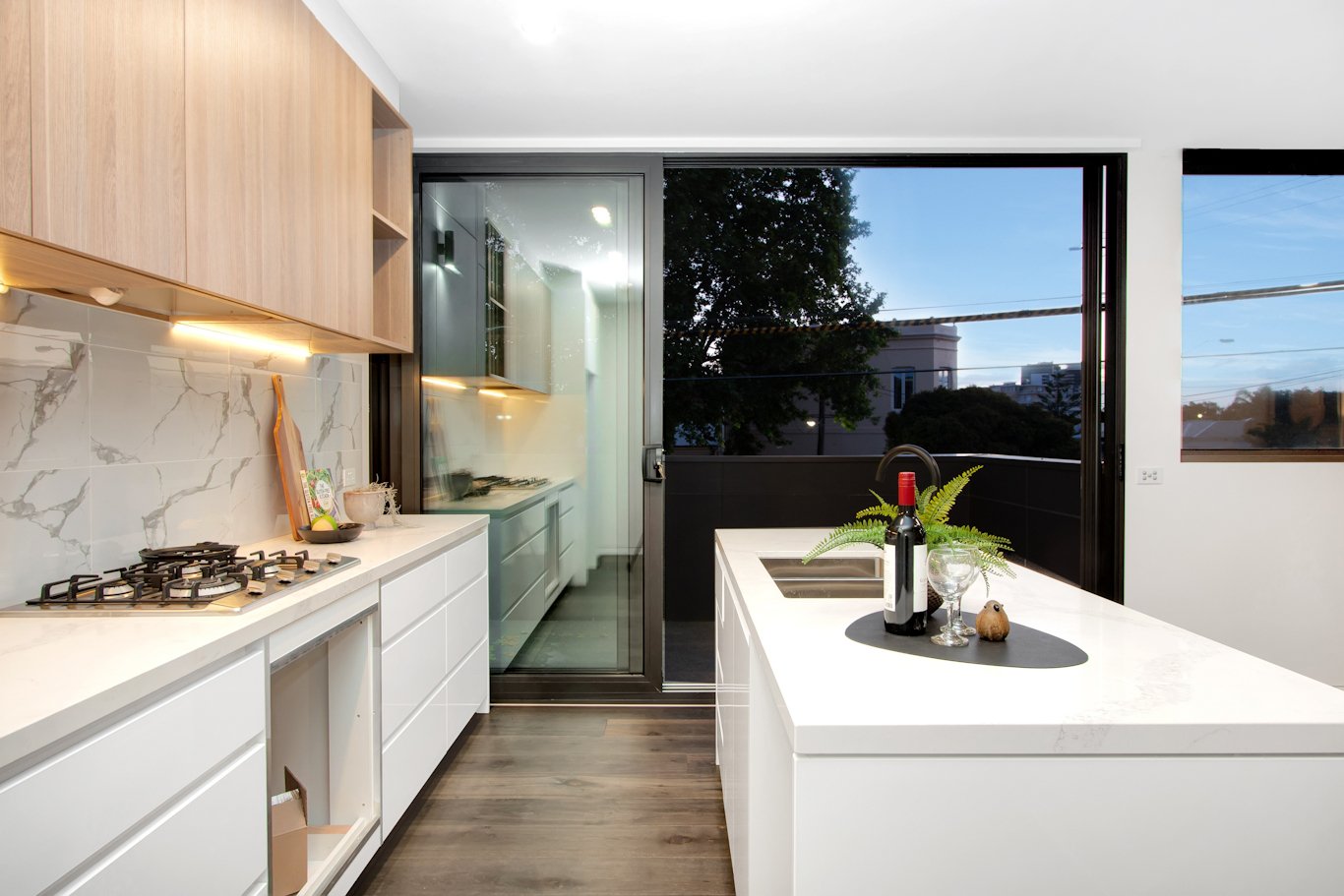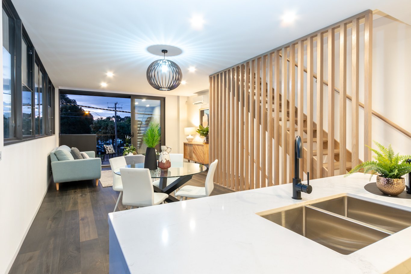 Level 1 offers open plan living and dining with northerly orientated balcony, nicely appointed kitchen with Miele appliances and stone benches plus additional balcony.