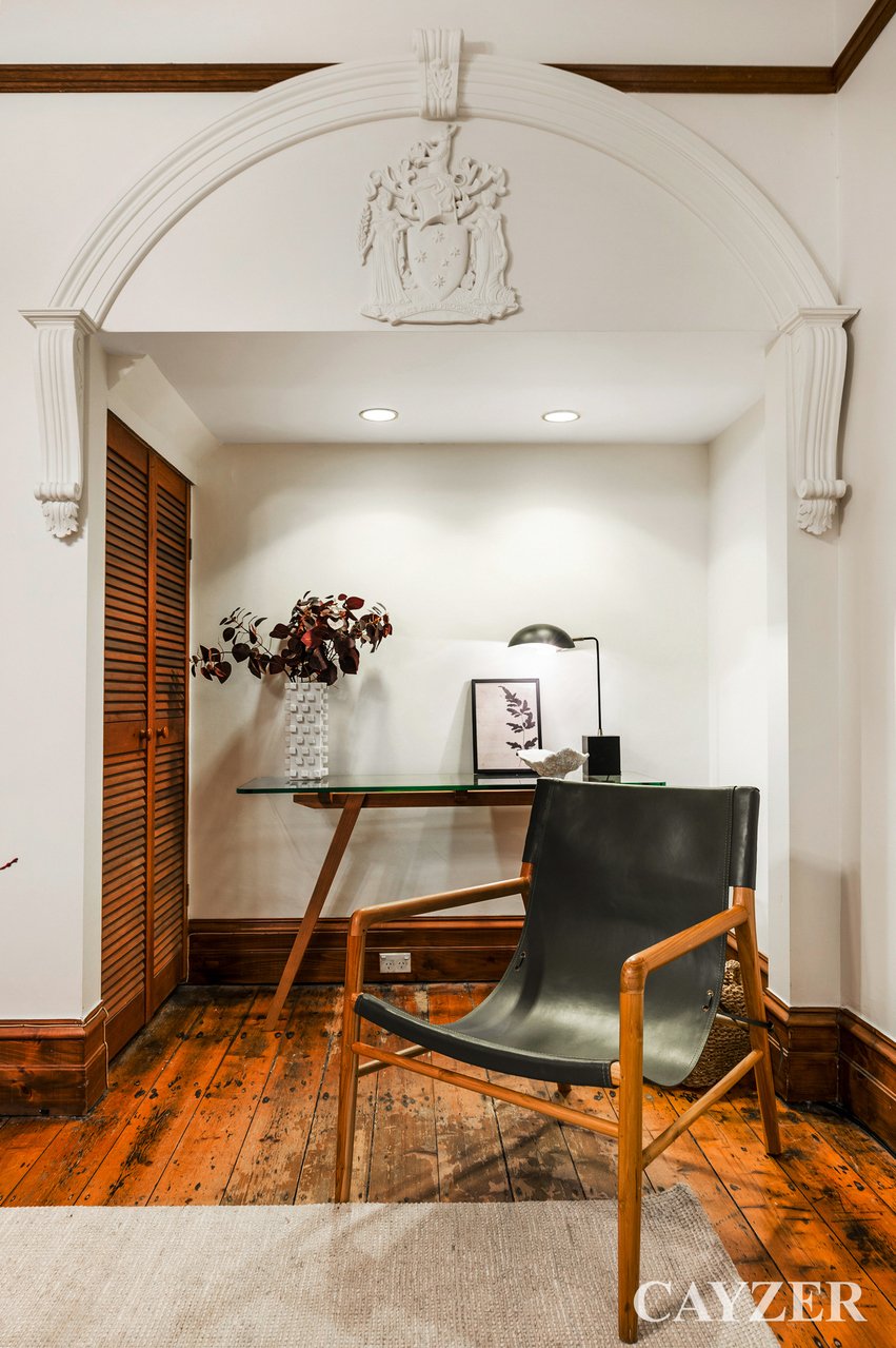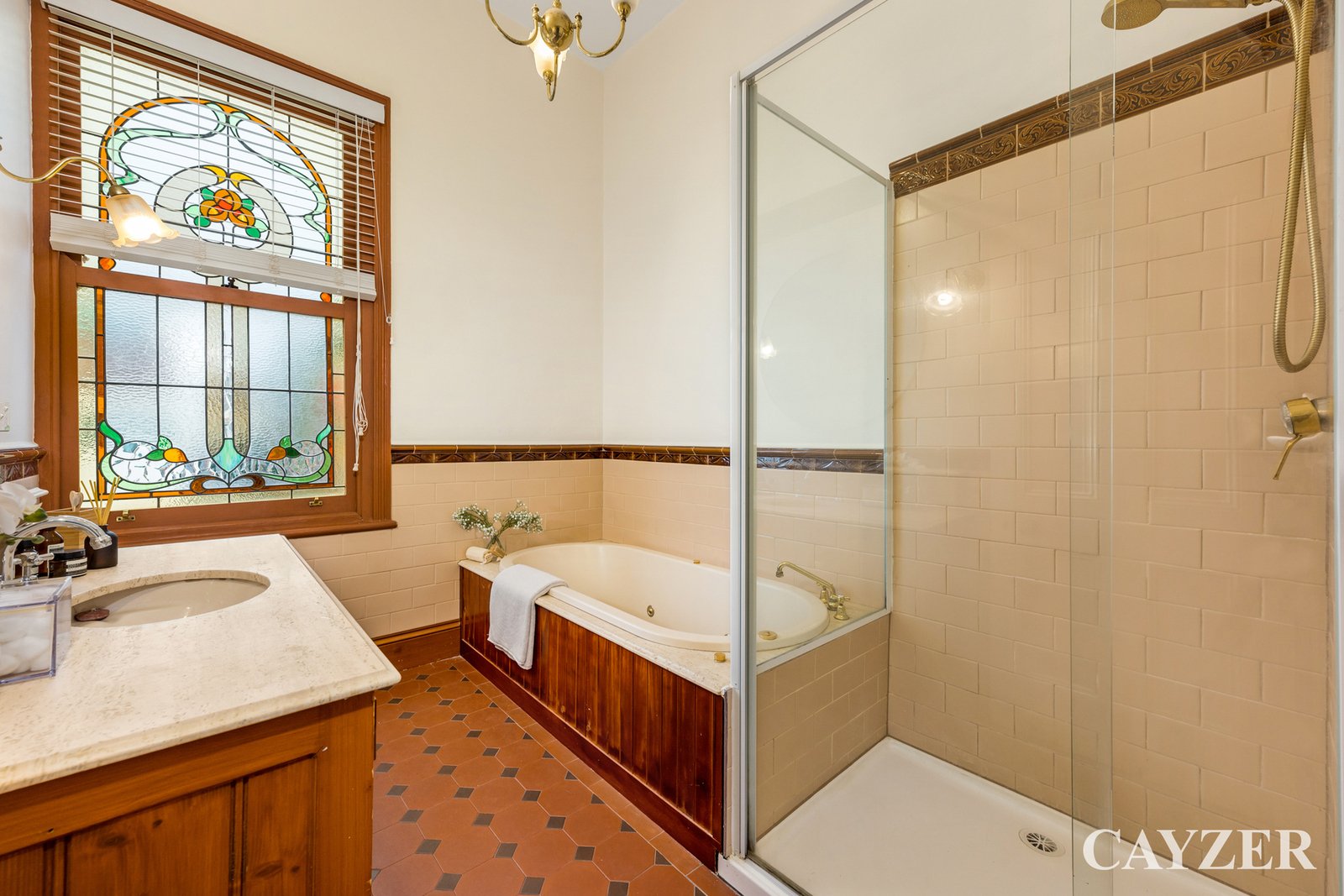 A spacious first floor master bedroom overlooks the street below and is served by a cleverly laid out walk in robe through to a heritage style bathroom with travertine vanity and bathtub all illuminated via a delightfully colourful leadlight window. This dress circle residence also features an additional ground floor powder room, hydronic heating and pedestrian ROW.