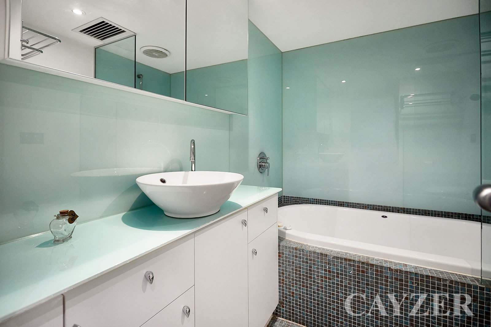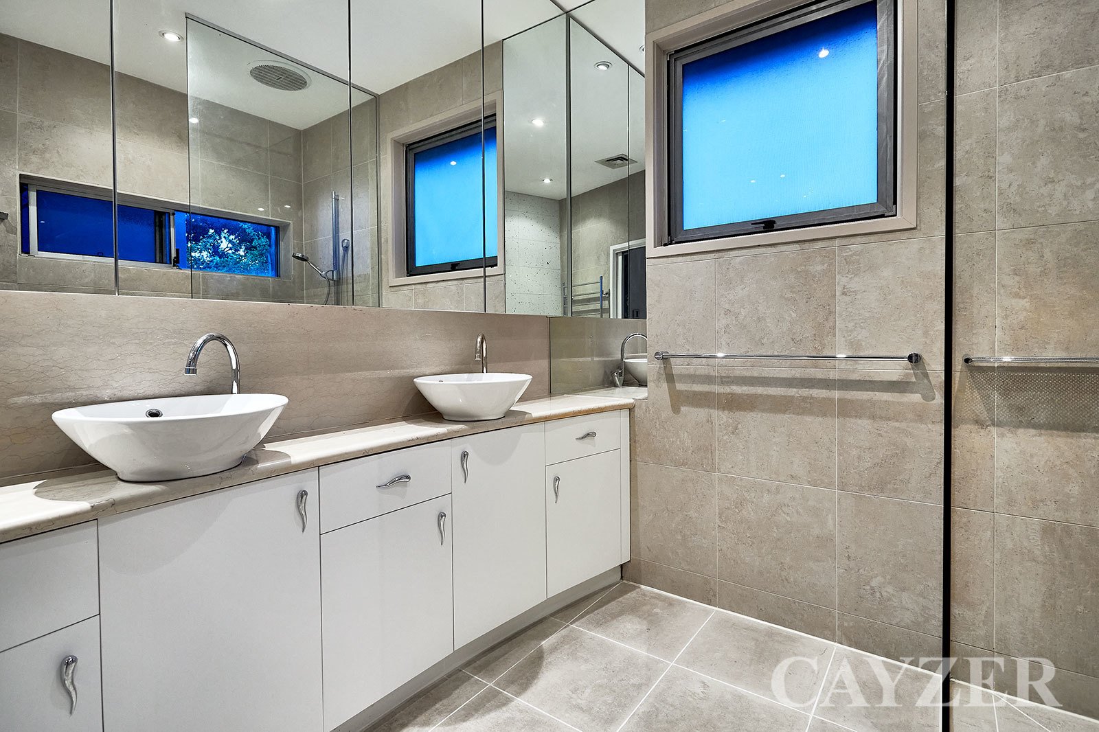 First Floor: Enormous main bedroom featuring full ensuite and separate walk-in robe, second double bedroom (built-in robes) plus second central bathroom and concealed laundry.
