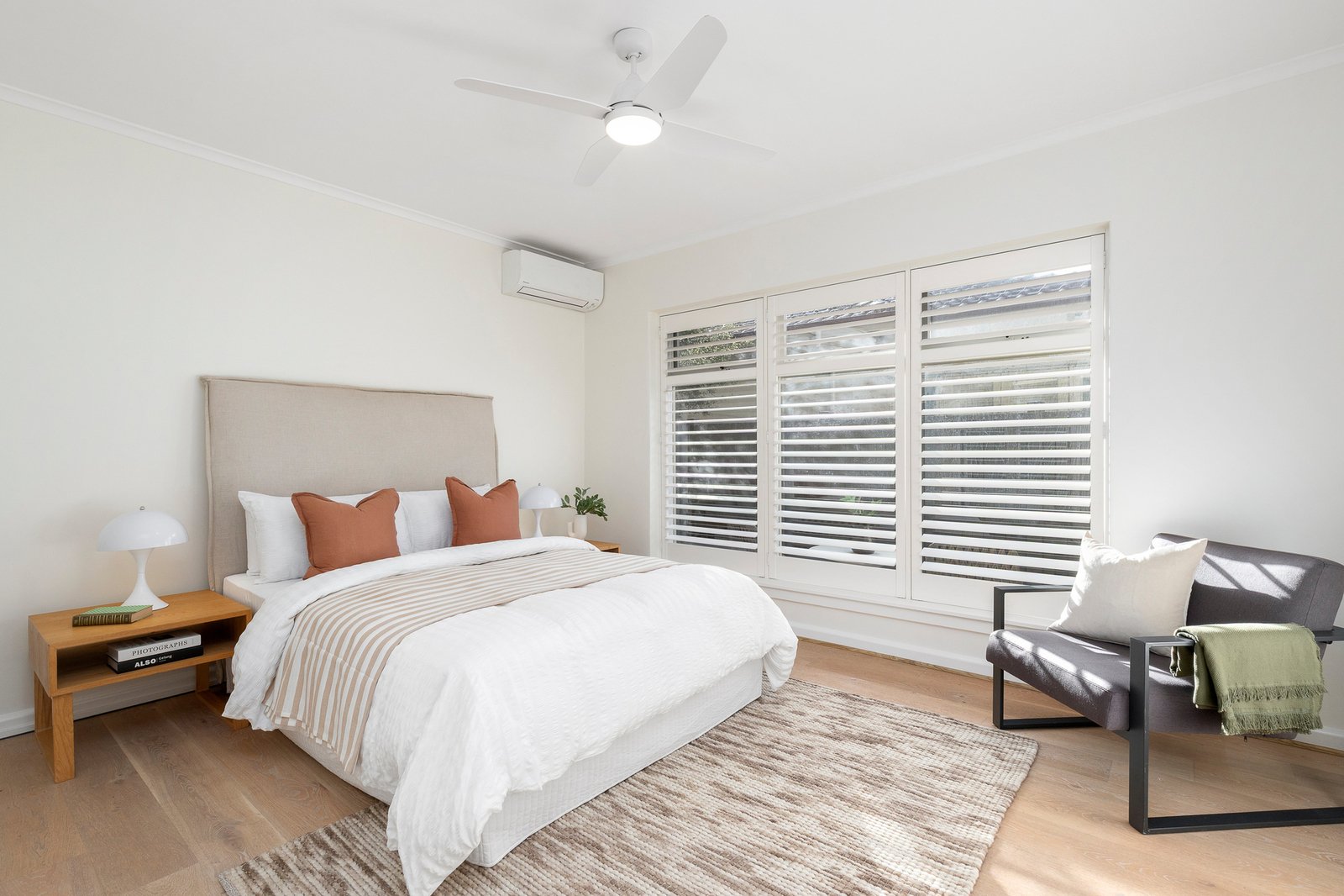 Both bedrooms are generously sized and positioned in a dedicated accommodation zone, each featuring mirrored built-in robes and easy access to a stylish bathroom with a marble vanity, bathtub and feature tiles. Additional highlights include a separate WC, laundry facilities, split system heating/cooling, plantation shutters and ceiling fans.