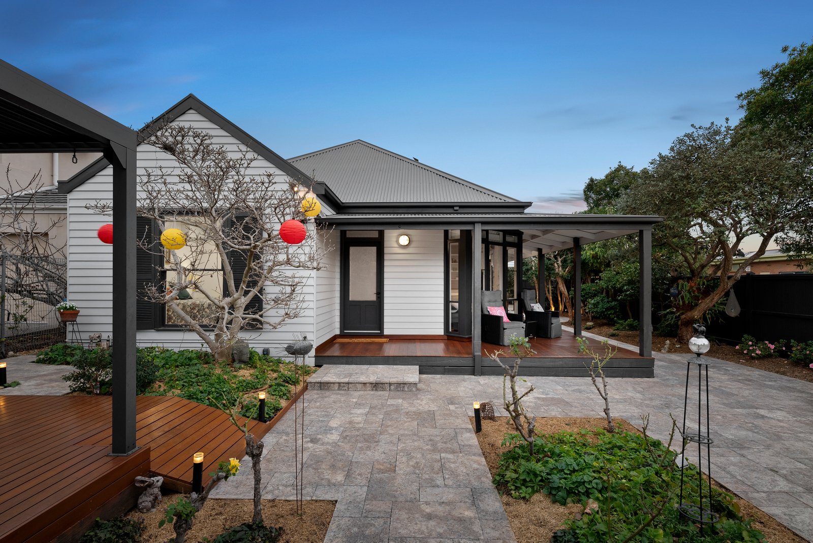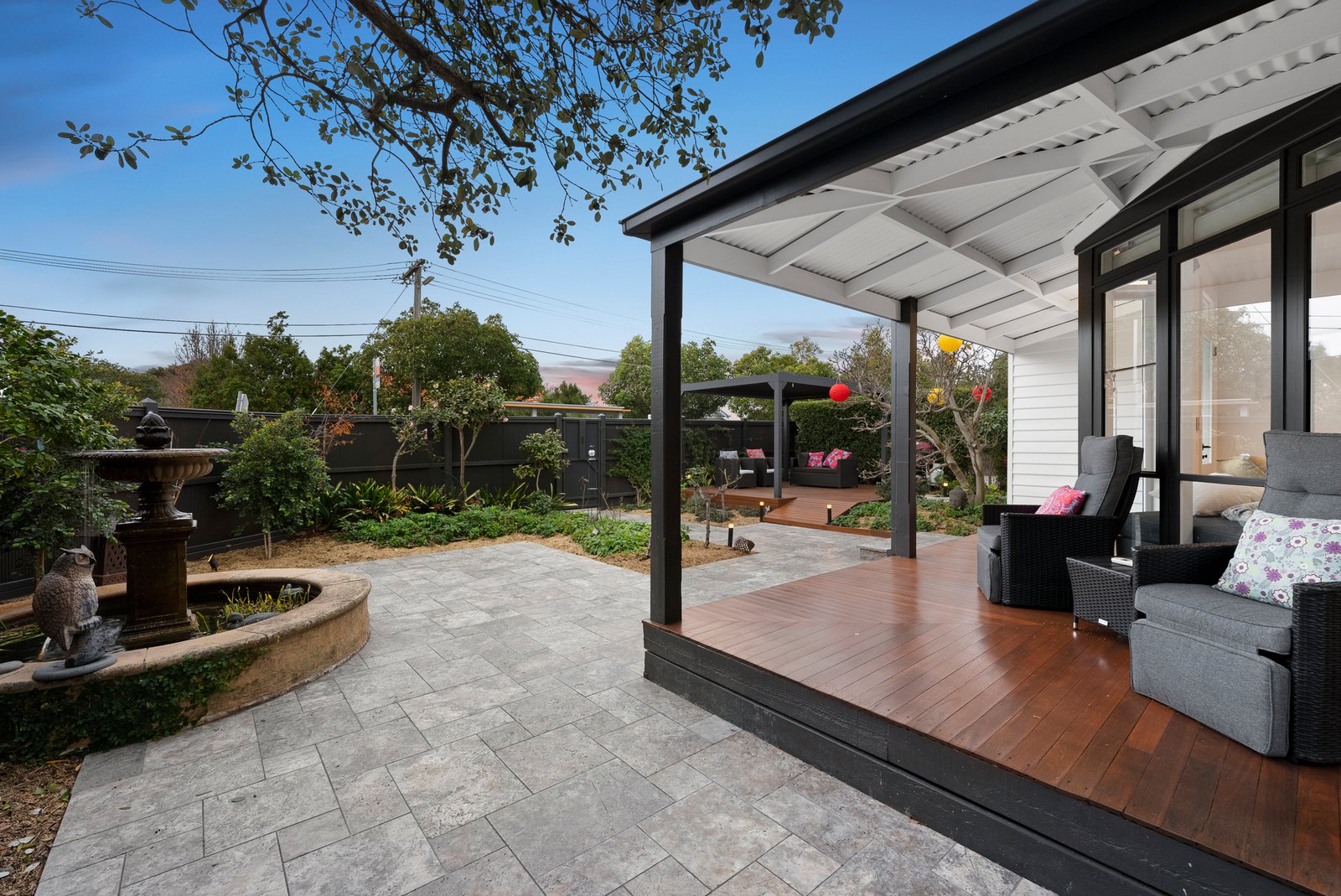 Soaring privacy fencing introduces the beautifully manicured surrounds, revealing an elevated louvred entertaining deck bathed in northern sunlight, with vistas across lush plantings and a tranquil water fountain - perfect for secluded al fresco dining or relaxed afternoon gatherings. A sweeping wraparound veranda provides an idyllic setting to sit with a good book or cup of tea, offering garden serenity at every turn. Indoors, high ceilings and warm timber floors continue the sense of calm and character throughout.