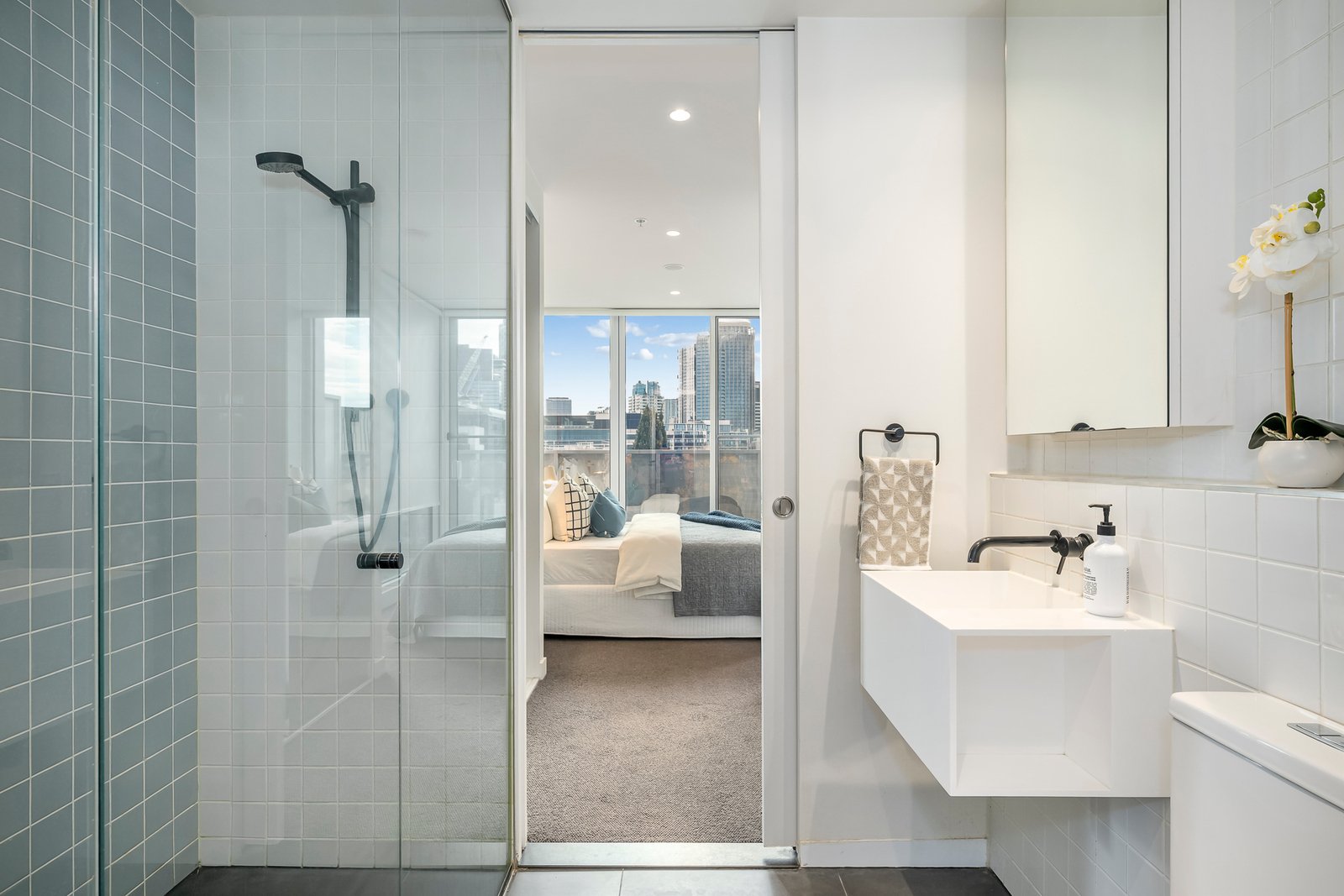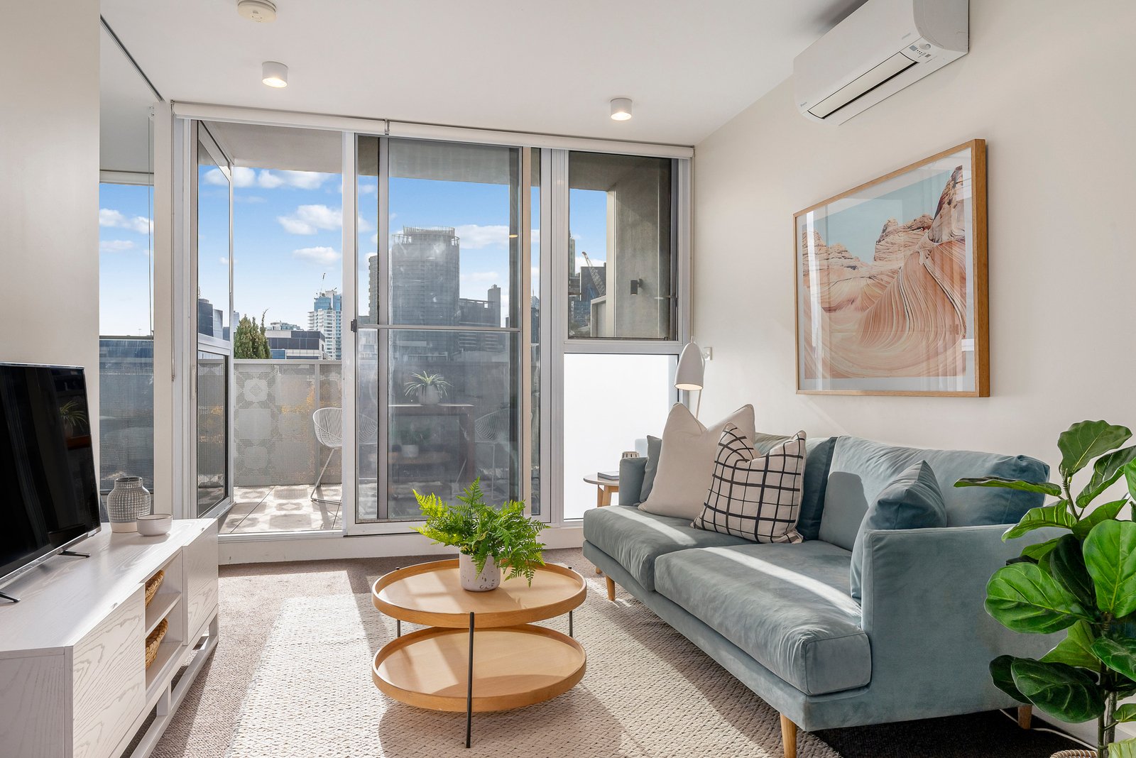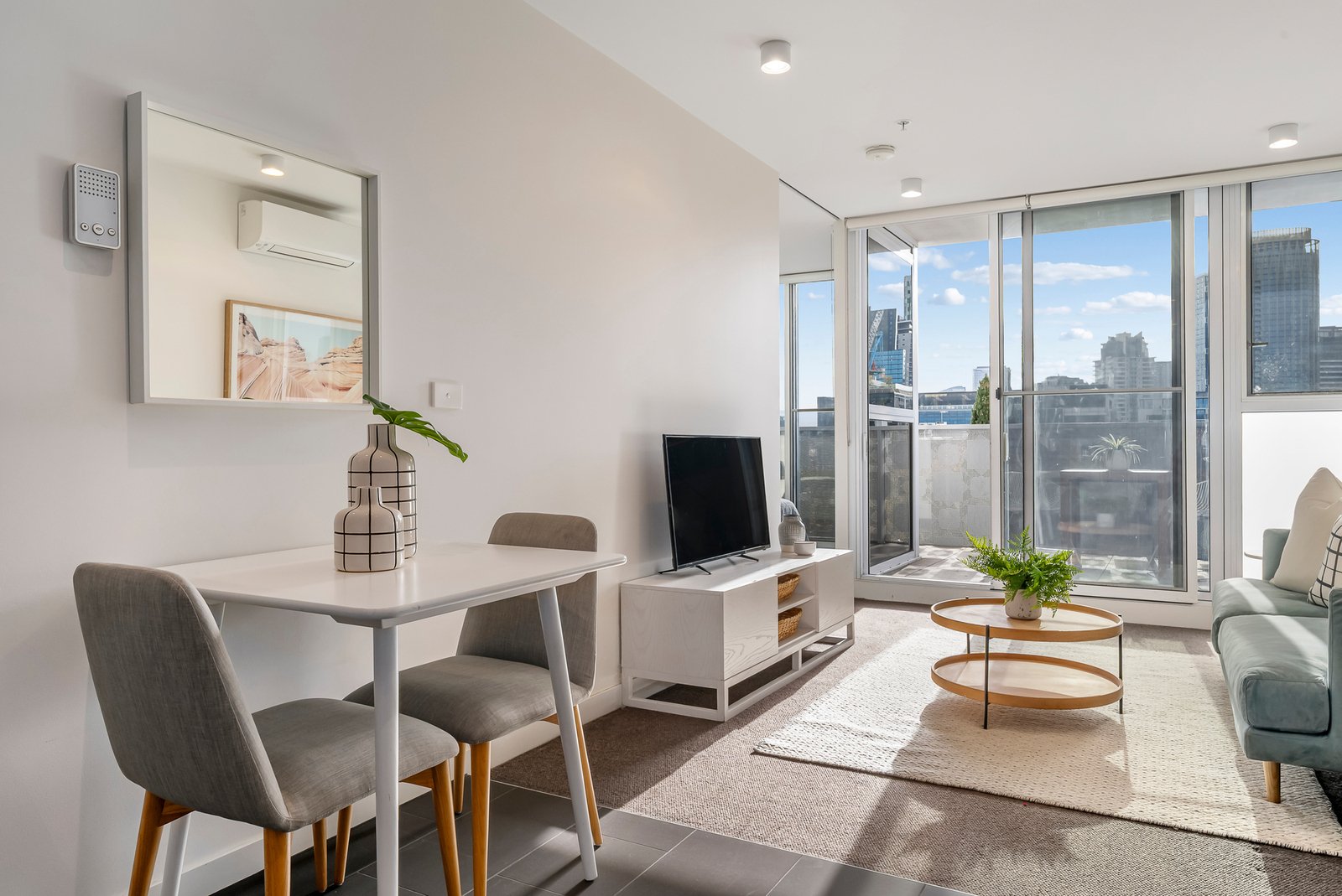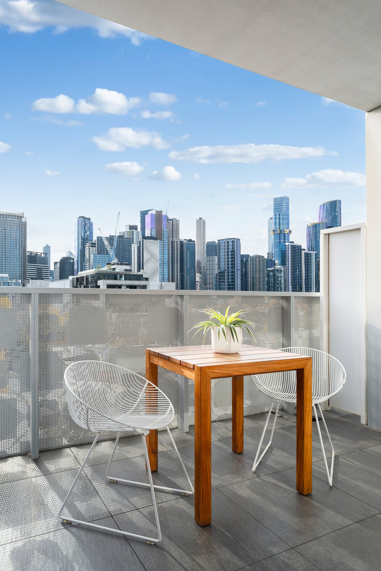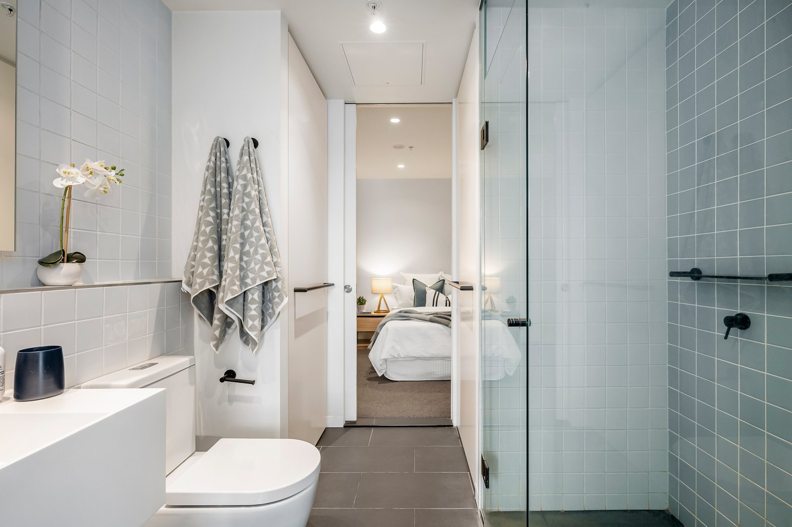 Positioned in one of South Melbourne’s most coveted pockets, this spacious one bedroom plus study or occasional two bedroom offers an exceptional inner city lifestyle and sublime city views The intelligently designed layout integrates the open plan kitchen, meals and lounge areas with a generous undercover balcony—ideal for year round alfresco living. The sleek kitchen is fitted with premium Asko appliances, including an integrated dishwasher and cooktop, combining style with efficiency. The well sized master bedroom features built in robes, while the versatile second room serves perfectly as either a bedroom or home office/study.