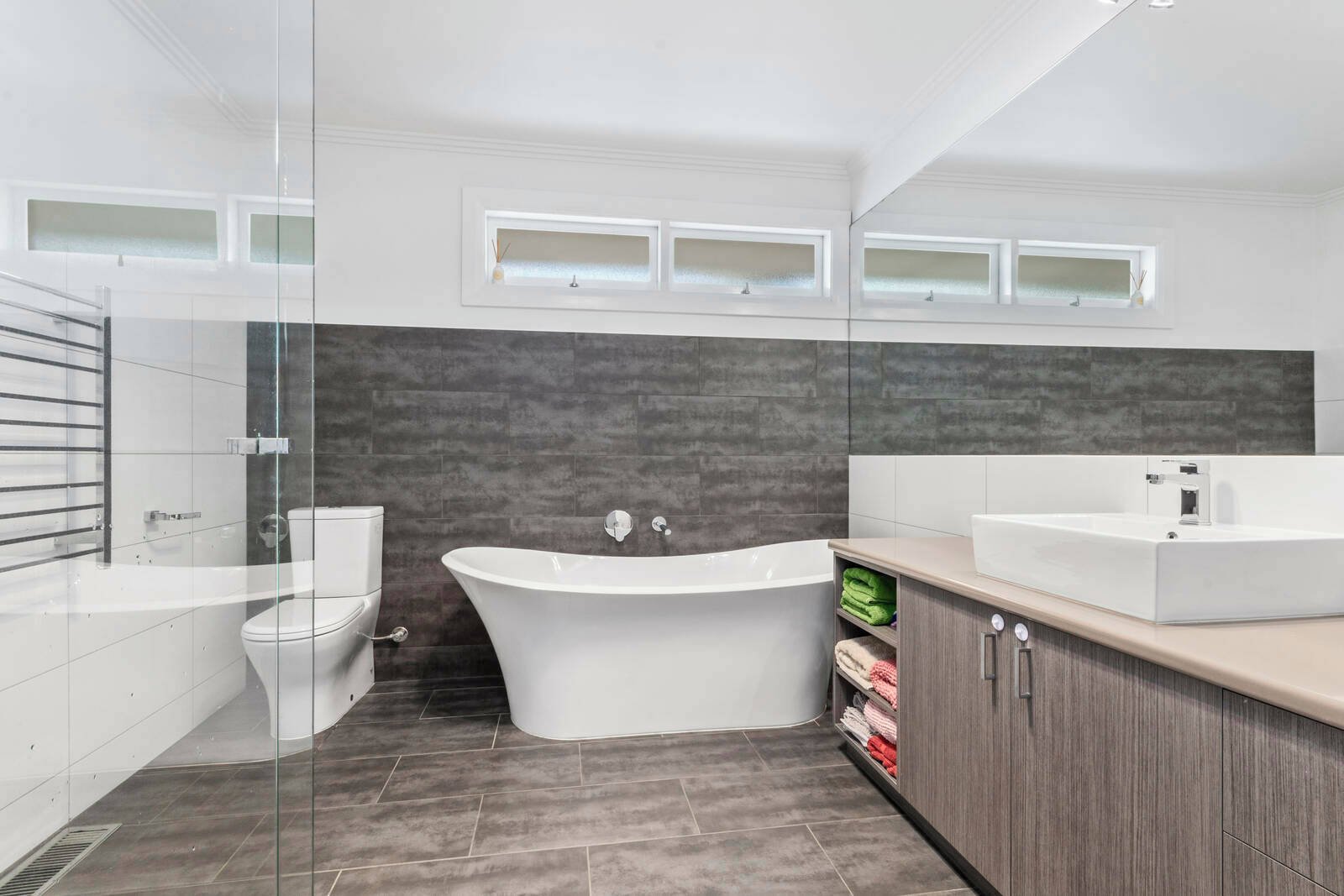 The home boasts three generous bedrooms, each fitted with floor-to-ceiling built-in robes and serviced by a sleek central bathroom featuring an oversized shower, freestanding bathtub, large vanity, and toilet. A second separate toilet adds convenience, along with a spacious laundry offering additional storage.