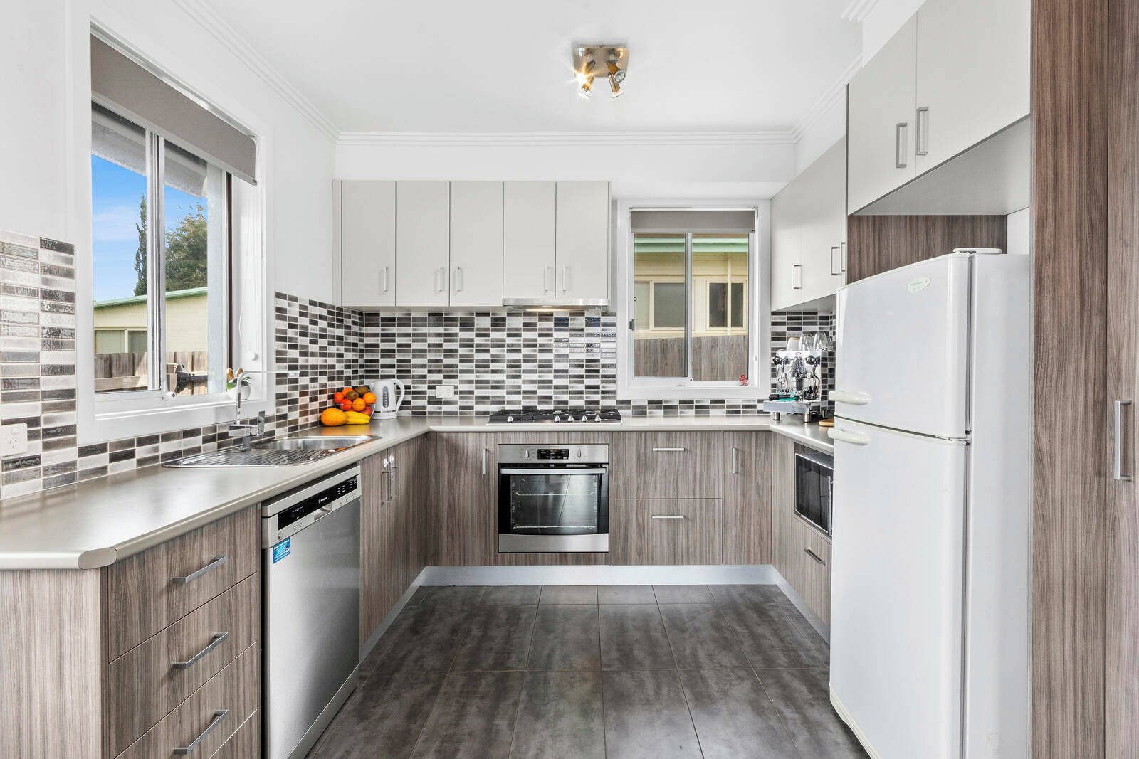 Flooded with natural light, the spacious open-plan living, kitchen, and dining area forms the heart of the home. Climate comfort is assured year-round with a reverse cycle split-system. The contemporary kitchen is well-appointed with a stainless-steel oven, 5-burner gas cooktop, dishwasher, wraparound benchtops, and a built-in pantry.