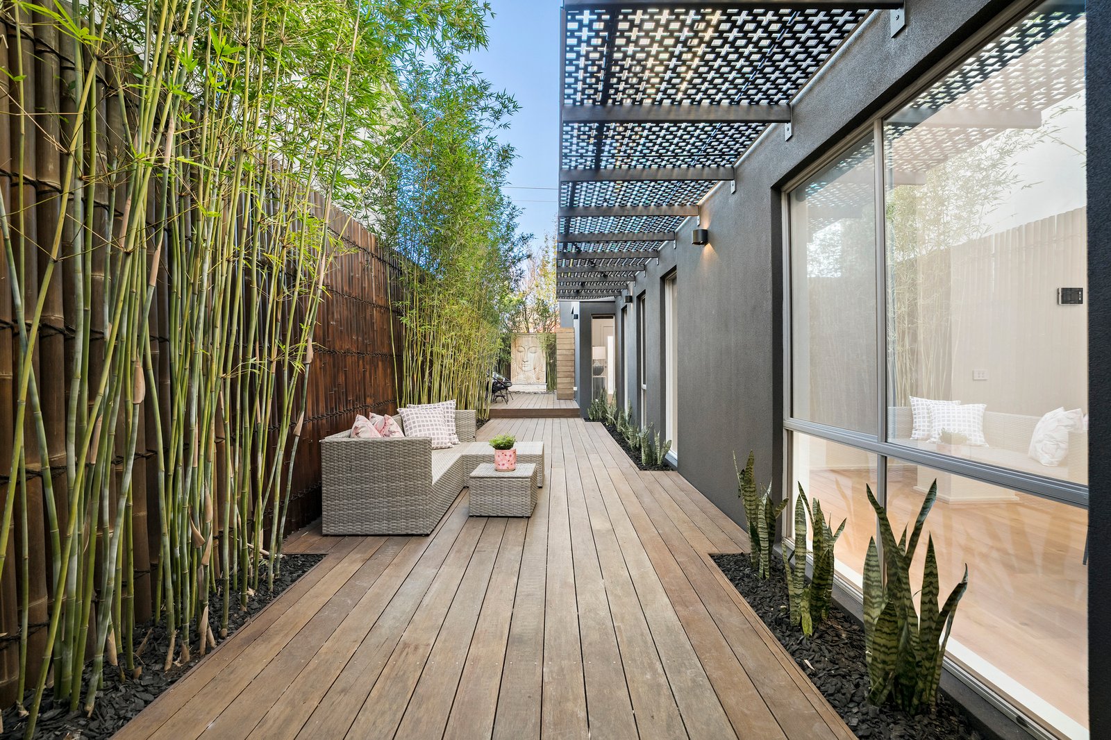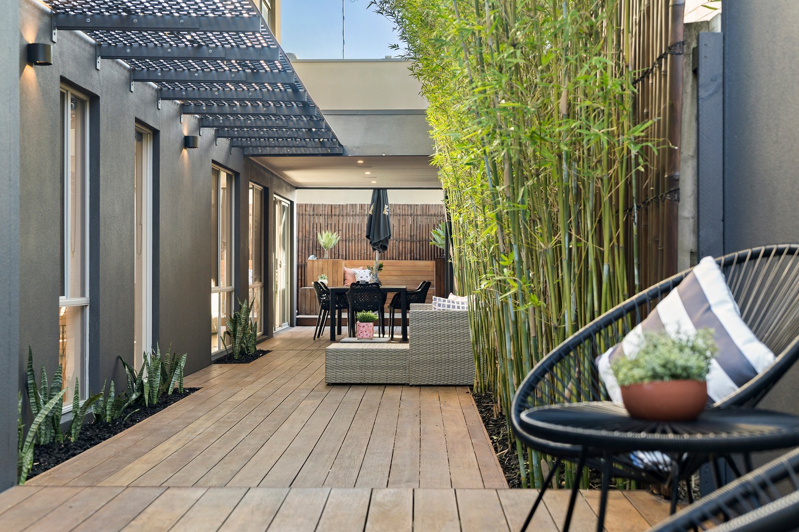 That smart design brings the living and entertaining focus to the ground floor around a sun-kissed open plan kitchen – perfectly connected to the deck and its dramatic bamboo borders.