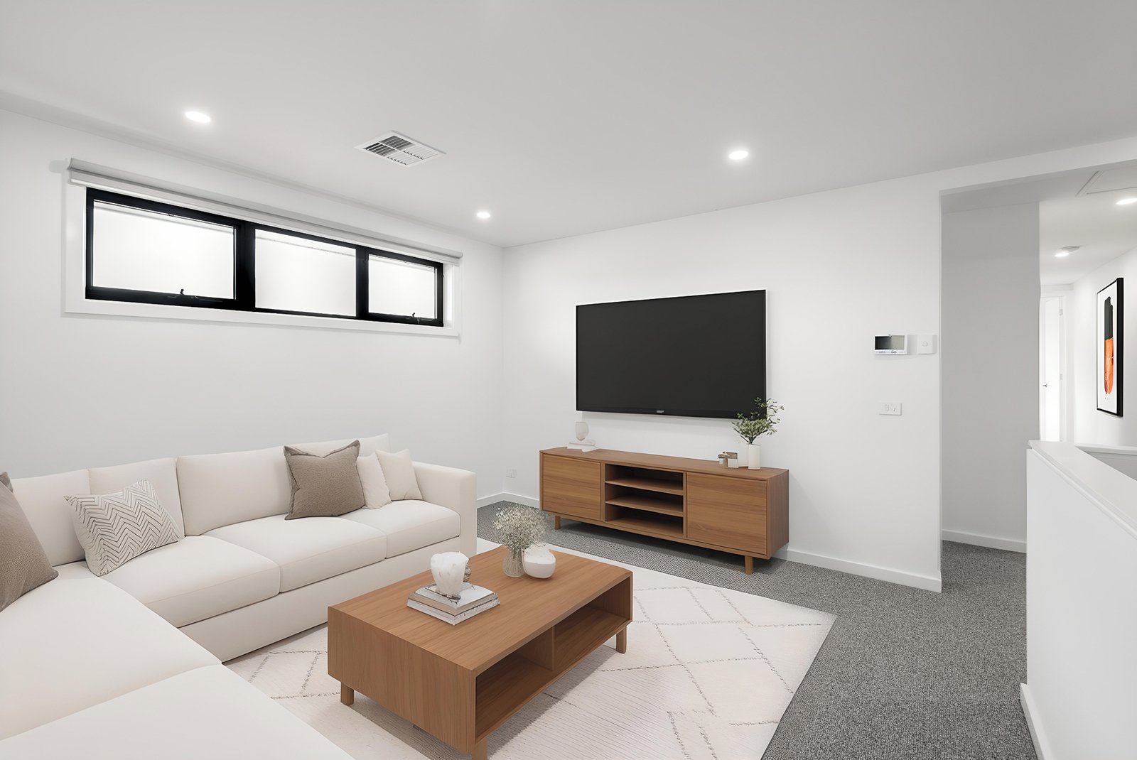 Upstairs offering master suite with large walk-in robe and full ensuite, second spacious living zone, two additional bedrooms, both with built in robes. Family bathroom with separate shower, bath and double vanity.