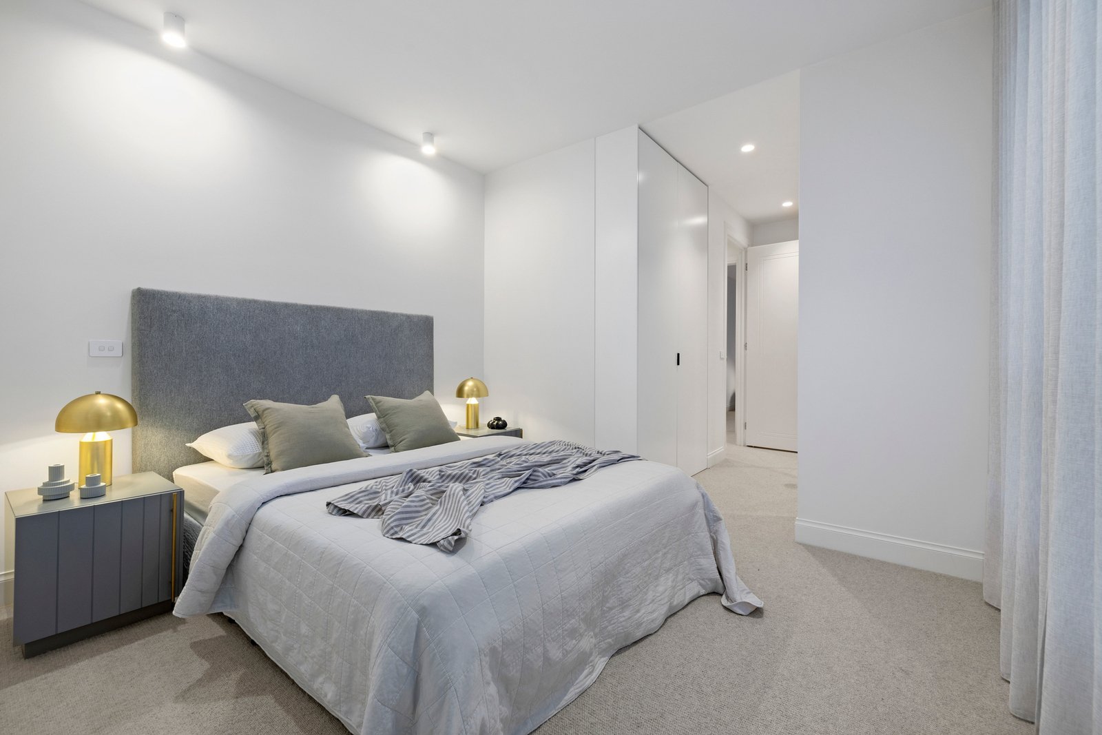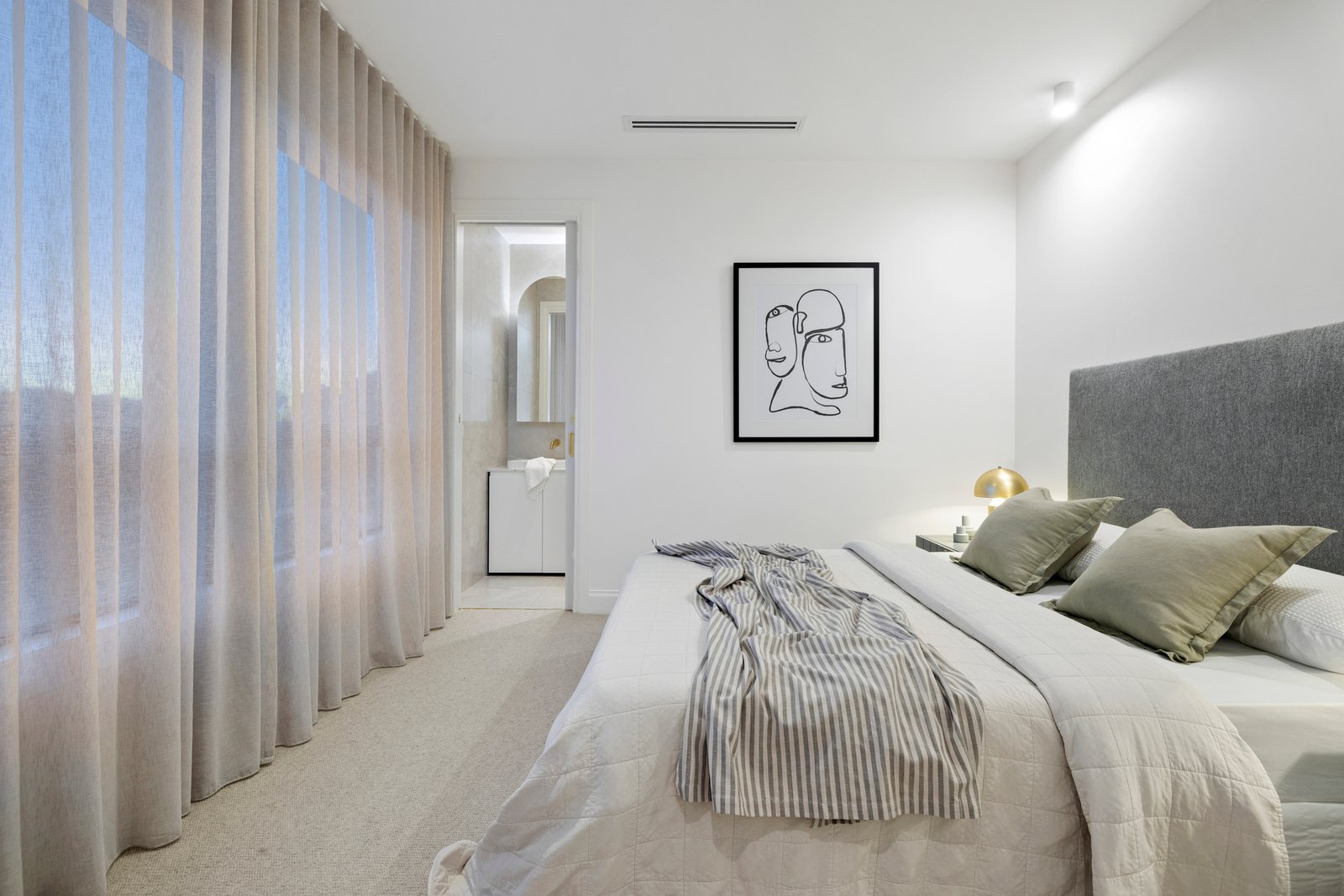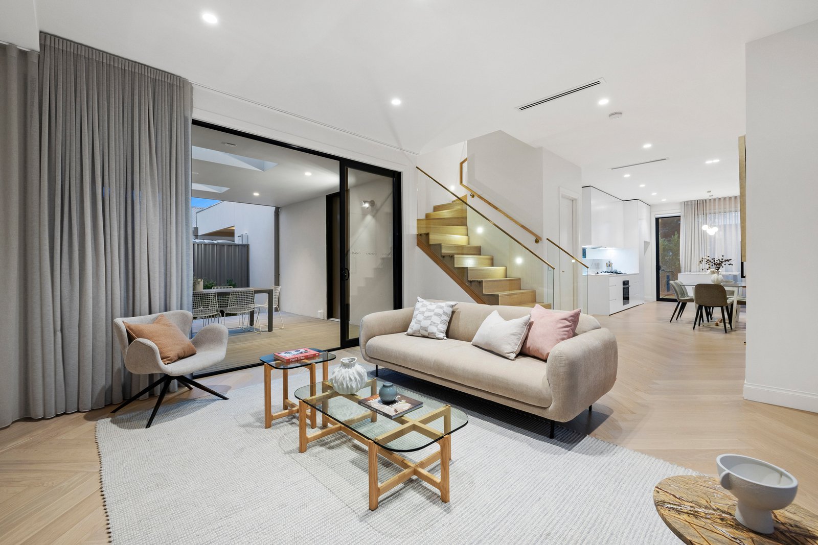 Only a year old and completed to an exacting standard, the home’s exceptional interiors are crowned by soaring 3m high ceilings and enhanced by towering doors and high-end finishes such as chic herringbone flooring, premium carpets, luxe sheer curtains, brushed gold fixtures, exquisite stone surfaces and solar powered.
