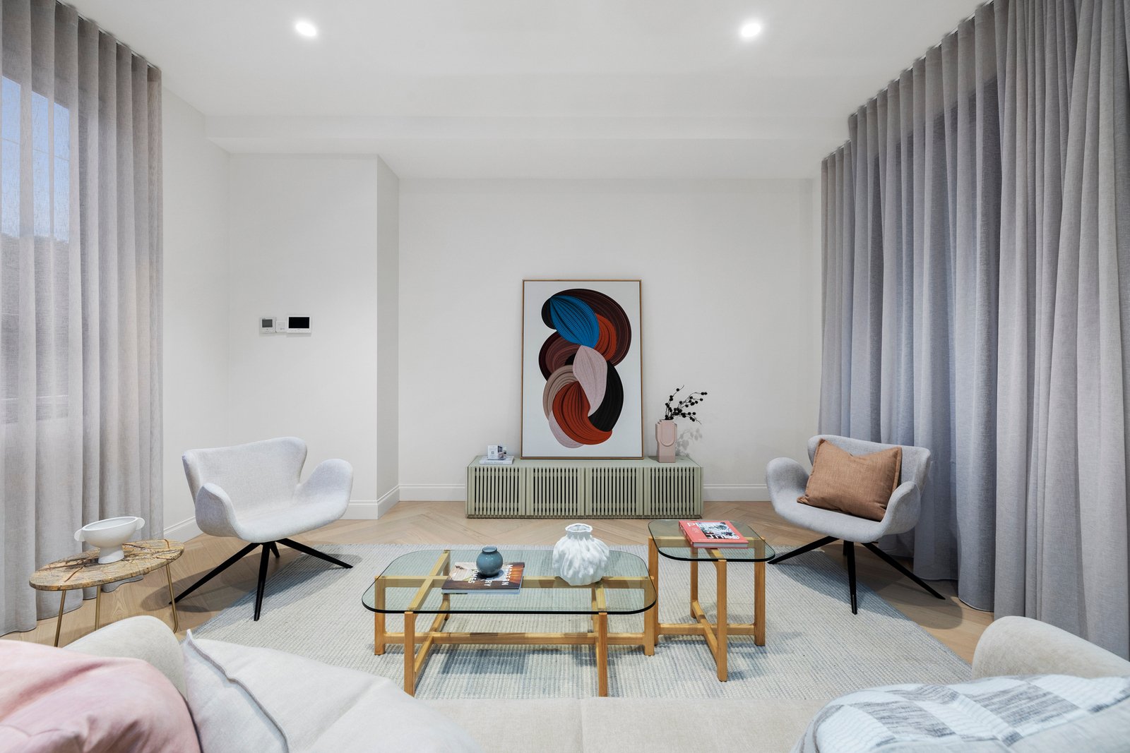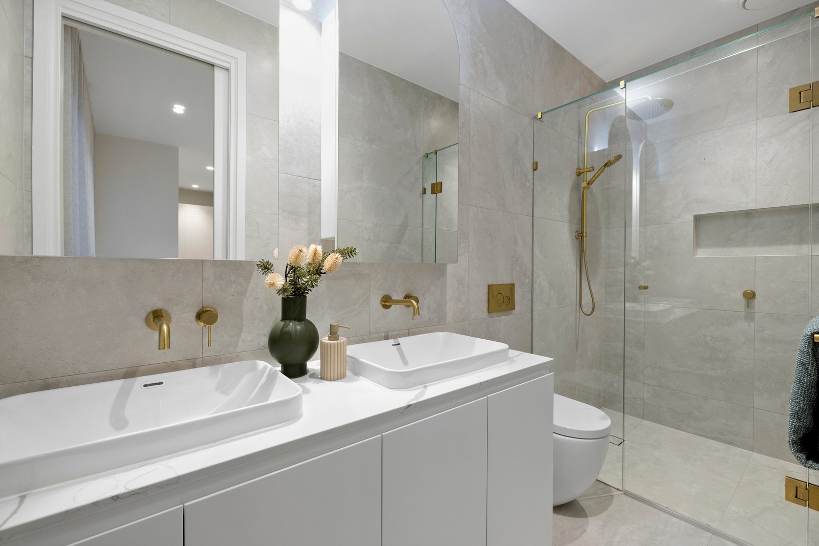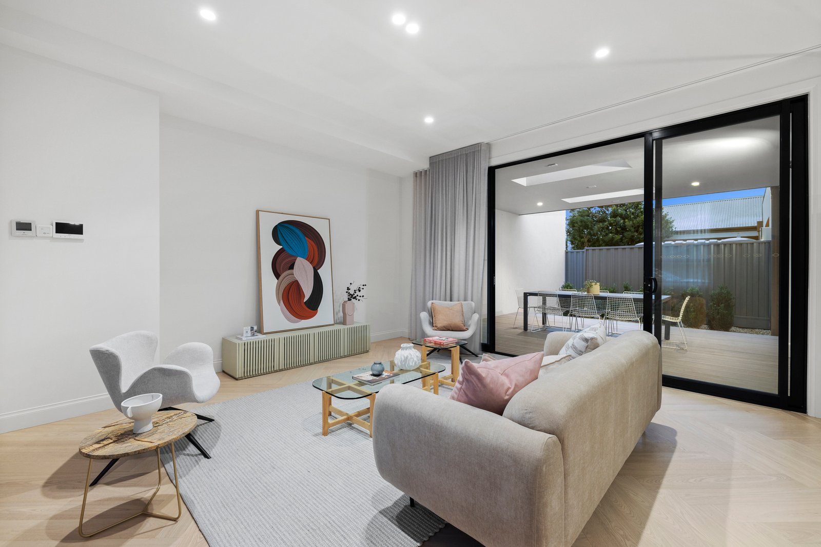Only a year old and completed to an exacting standard, the home’s exceptional interiors are crowned by soaring 3m high ceilings and enhanced by towering doors and high-end finishes such as chic herringbone flooring, premium carpets, luxe sheer curtains, brushed gold fixtures, exquisite stone surfaces and solar powered.