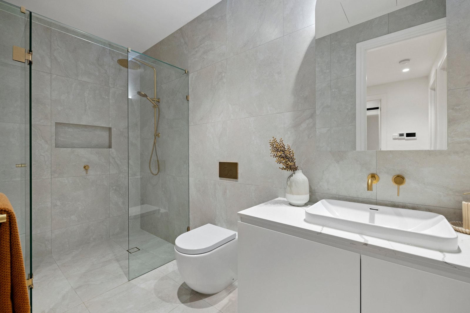 Positioned upstairs for utmost privacy and quietude, the three serene bedrooms are all peaceful retreats. The main bedroom has extensive wardrobing and the luxury of its own fully-tiled ensuite whilst the remaining bedrooms – both with mirrored robes – share an equally impressive main bathroom with double-sized shower and magazine-worthy finishes.