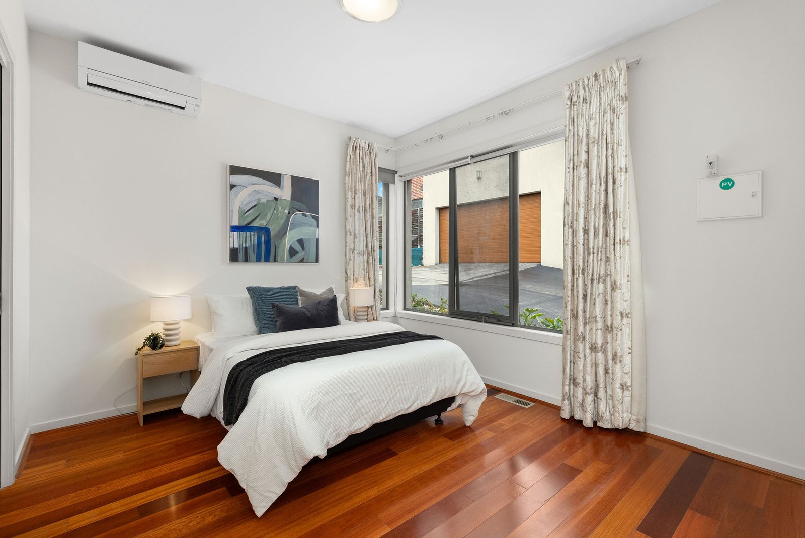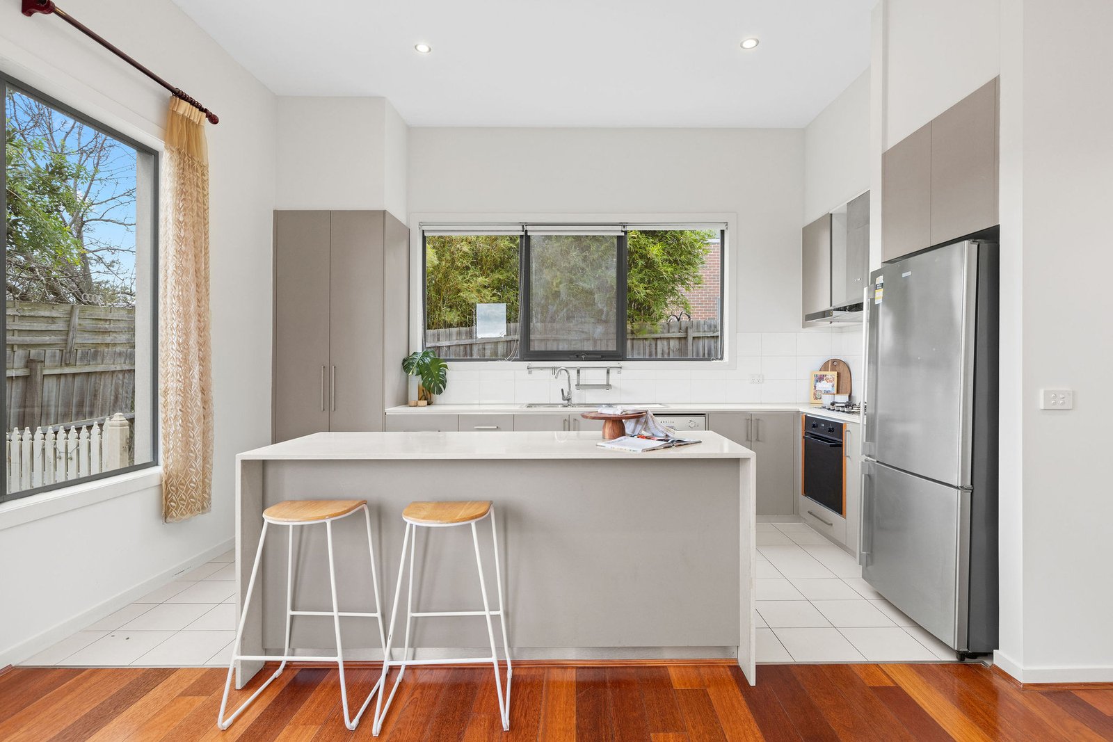 Step inside to a light-filled open-plan living and dining area, where natural warmth meets modern design. The sleek kitchen is a highlight, appointed with stone benchtops, quality appliances, gas cooking, and ample storage, seamlessly connecting to a private courtyard – a tranquil space for alfresco dining or relaxed weekend gatherings.
