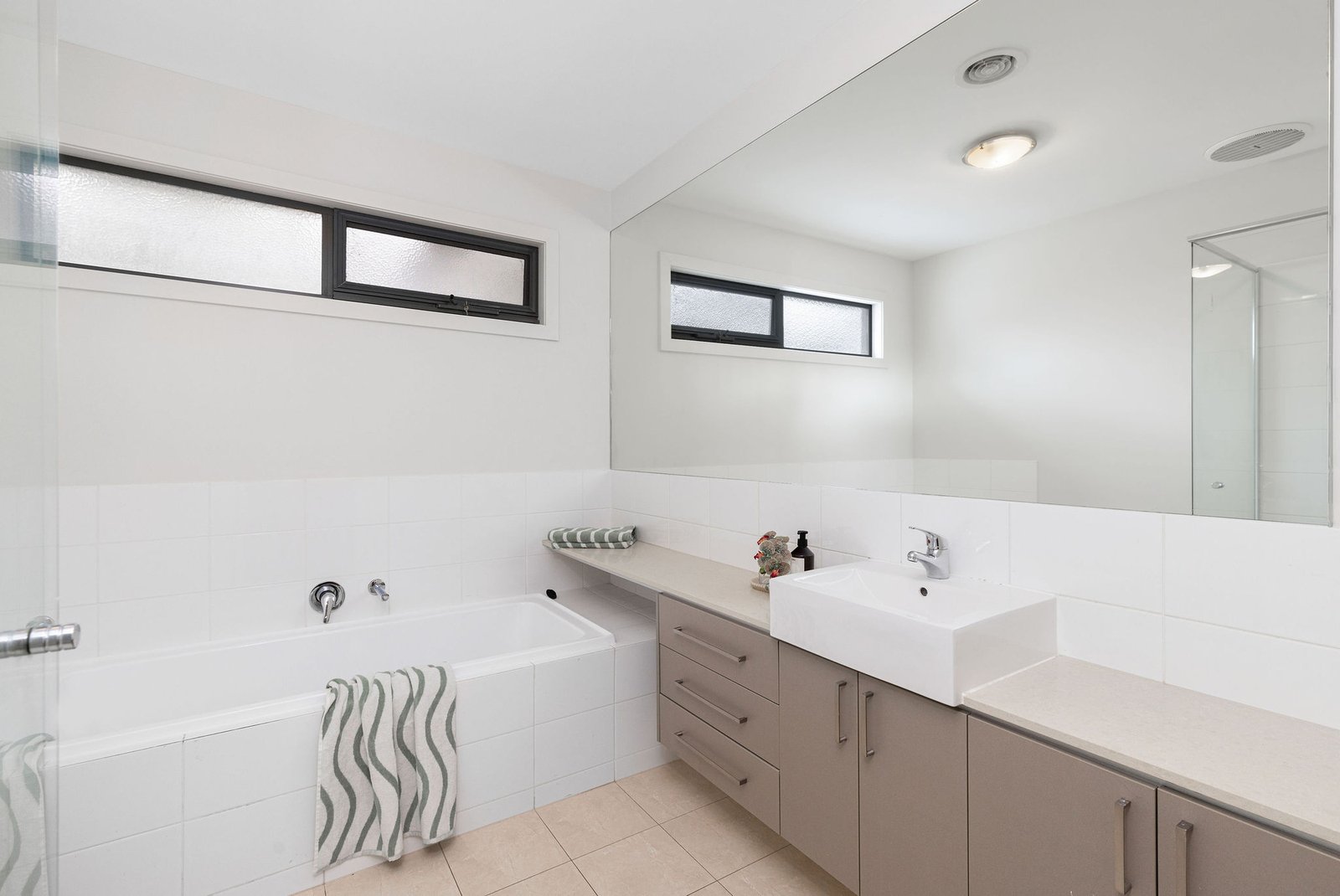 Year-round comfort is assured with ducted heating, split-system air conditioning, and solar panels for energy efficiency. The ground-floor master suite provides a private haven, complete with a walk-in robe and stylish ensuite. Upstairs, two generously sized bedrooms with built-in robes are filled with natural light and share a spacious family bathroom with a separate toilet.