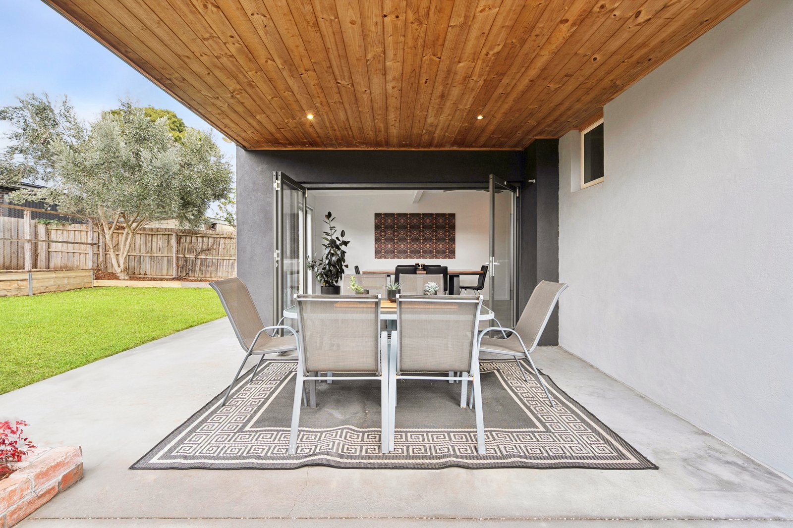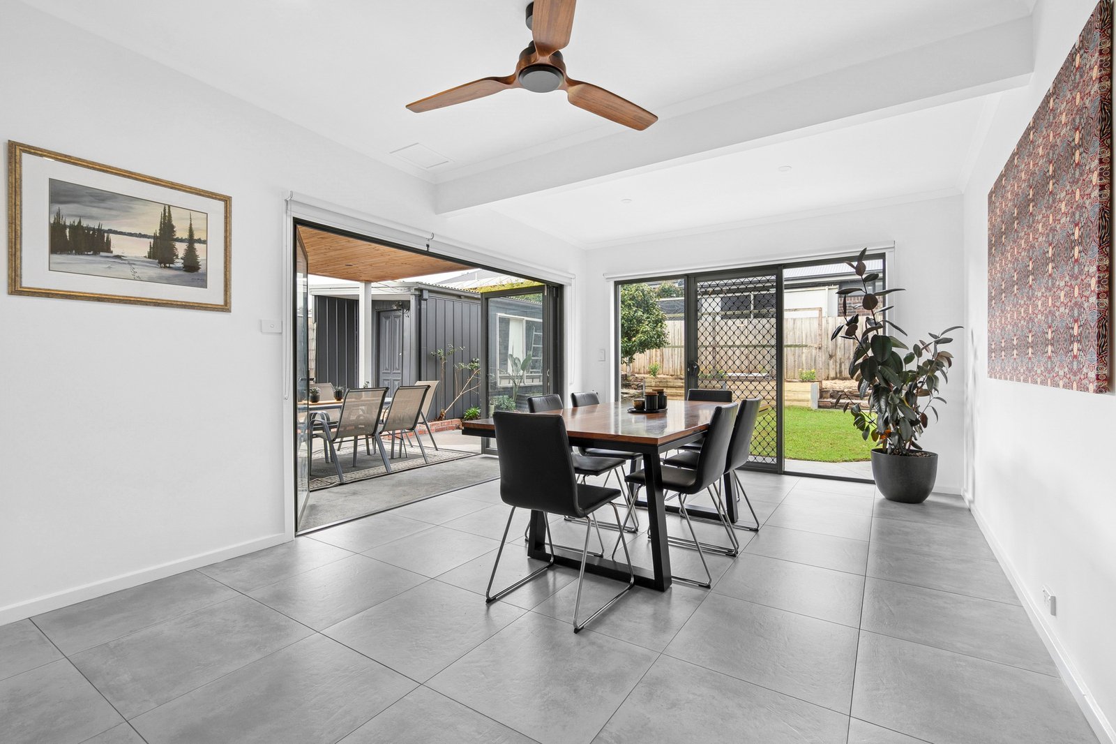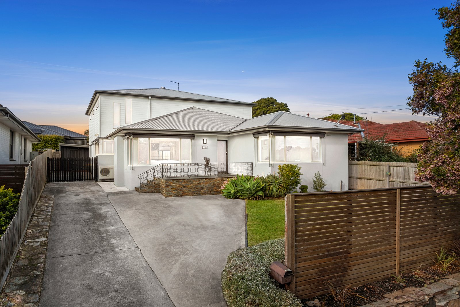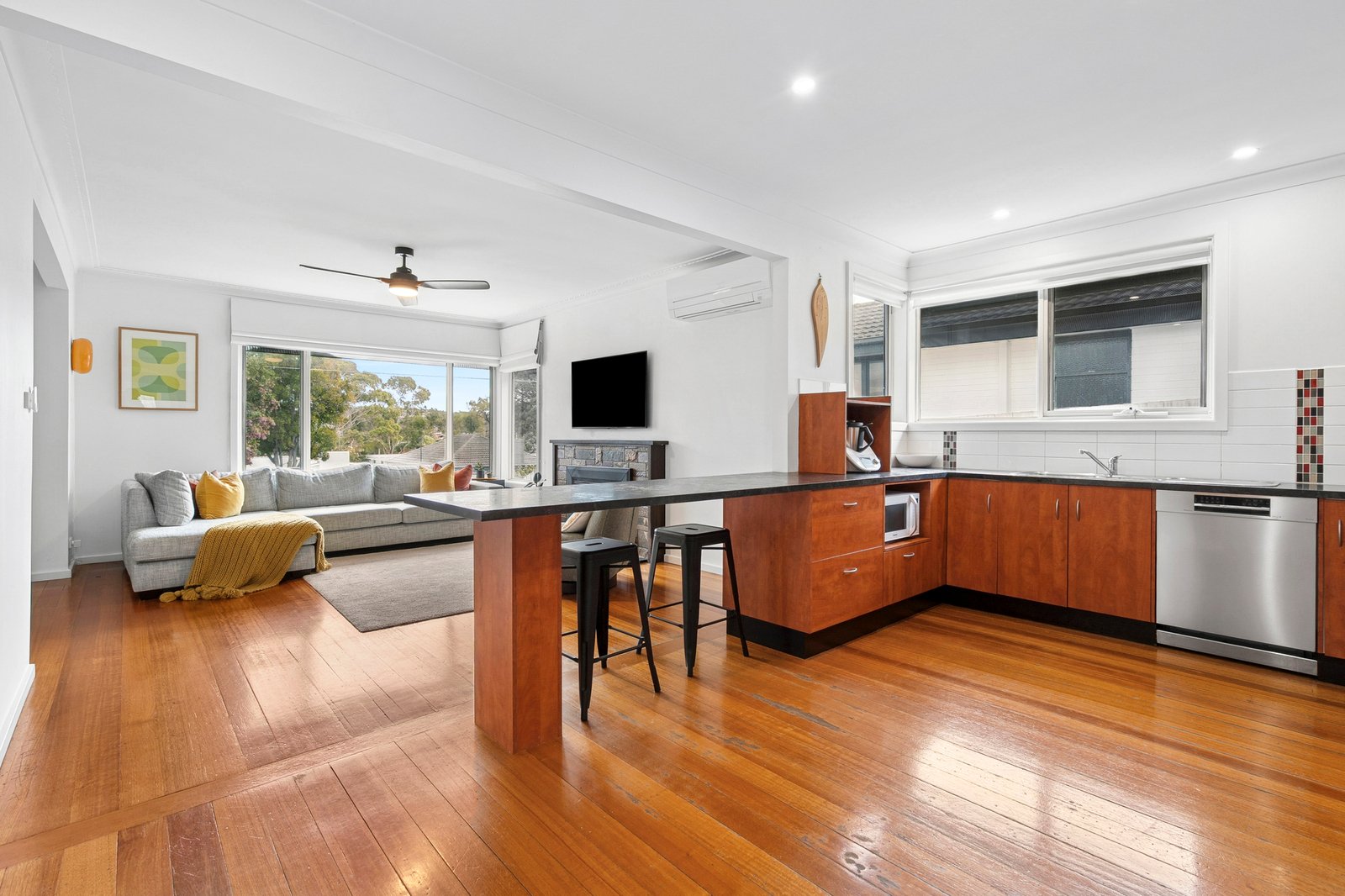 Perched on an elevated allotment, the two-storey façade is grand in stature. From the entry, an inviting lounge features polished timber floors, an original mantel with gas log fire, and a picturesque outlook with views to the Highton hills. The open plan layout flows into a well-equipped kitchen featuring quality appliances including a Smeg 900mm oven and cooktop, Bosch dishwasher, ample bench space with breakfast bar seating, and generous storage provisions. Centrally positioned between the living area and dining space, the layout allows for easy everyday living and entertaining. The spacious dining area at the rear is also suitable as additional living, with bifolds opening up to the alfresco, creating an effortless indoor-outdoor flow.