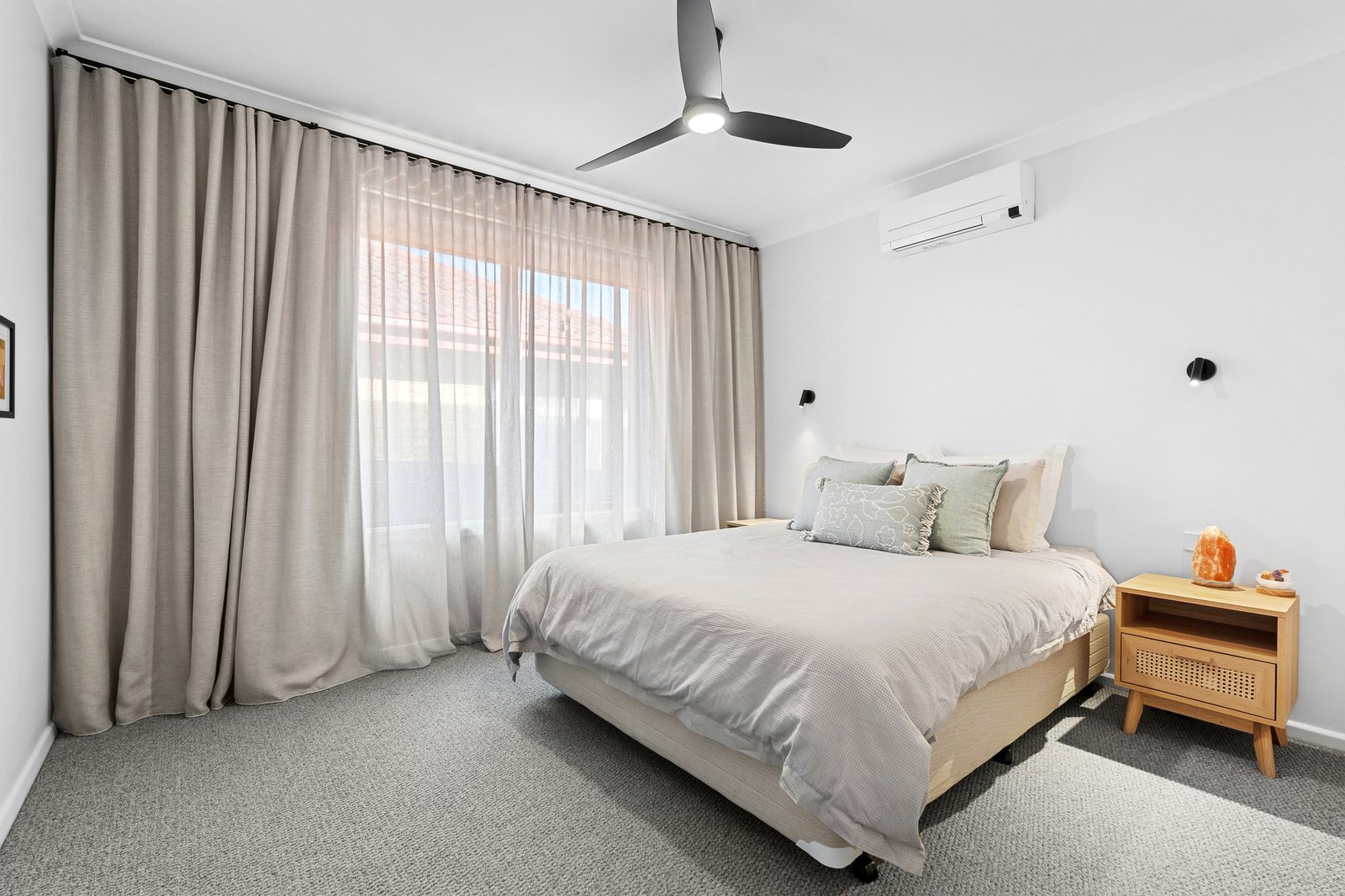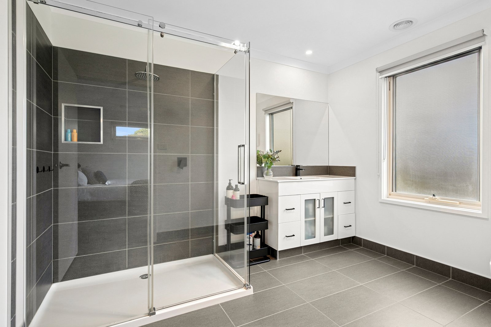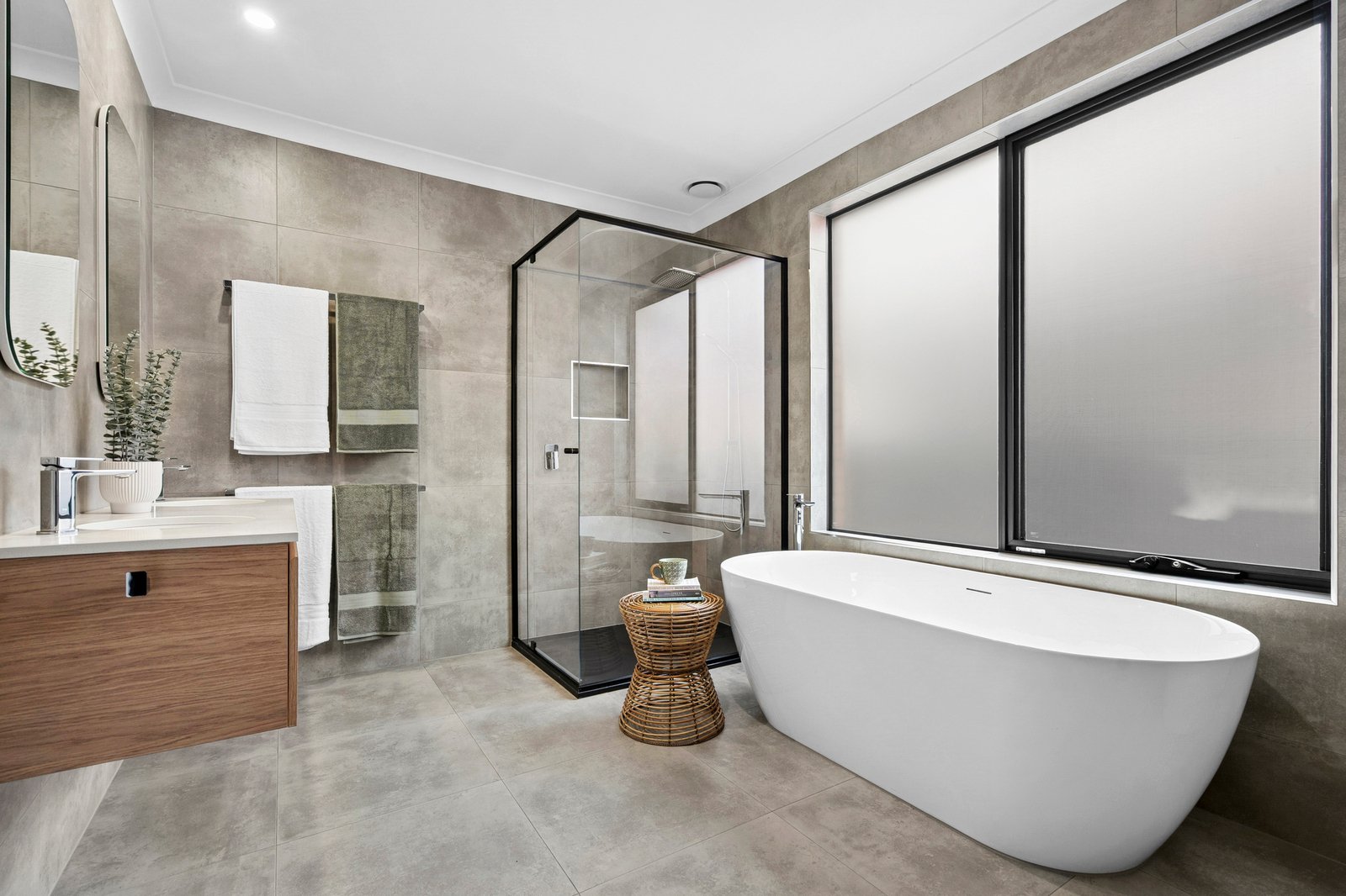 The ground floor main bedroom is a privately zoned retreat with walk-in robes and a contemporary ensuite luxuriously finished in floor to ceiling tiles, with freestanding bath, separate shower and dual vanity. Two further bedrooms on ground level feature built-in robes, one includes a second ensuite with walk-in shower.