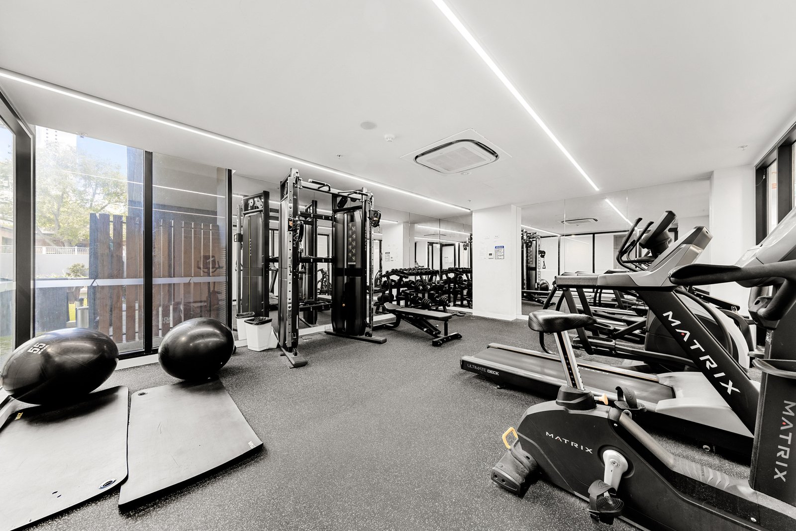 Modern gym open 24/7 for pre-work energizing or post-work rejuvenation.