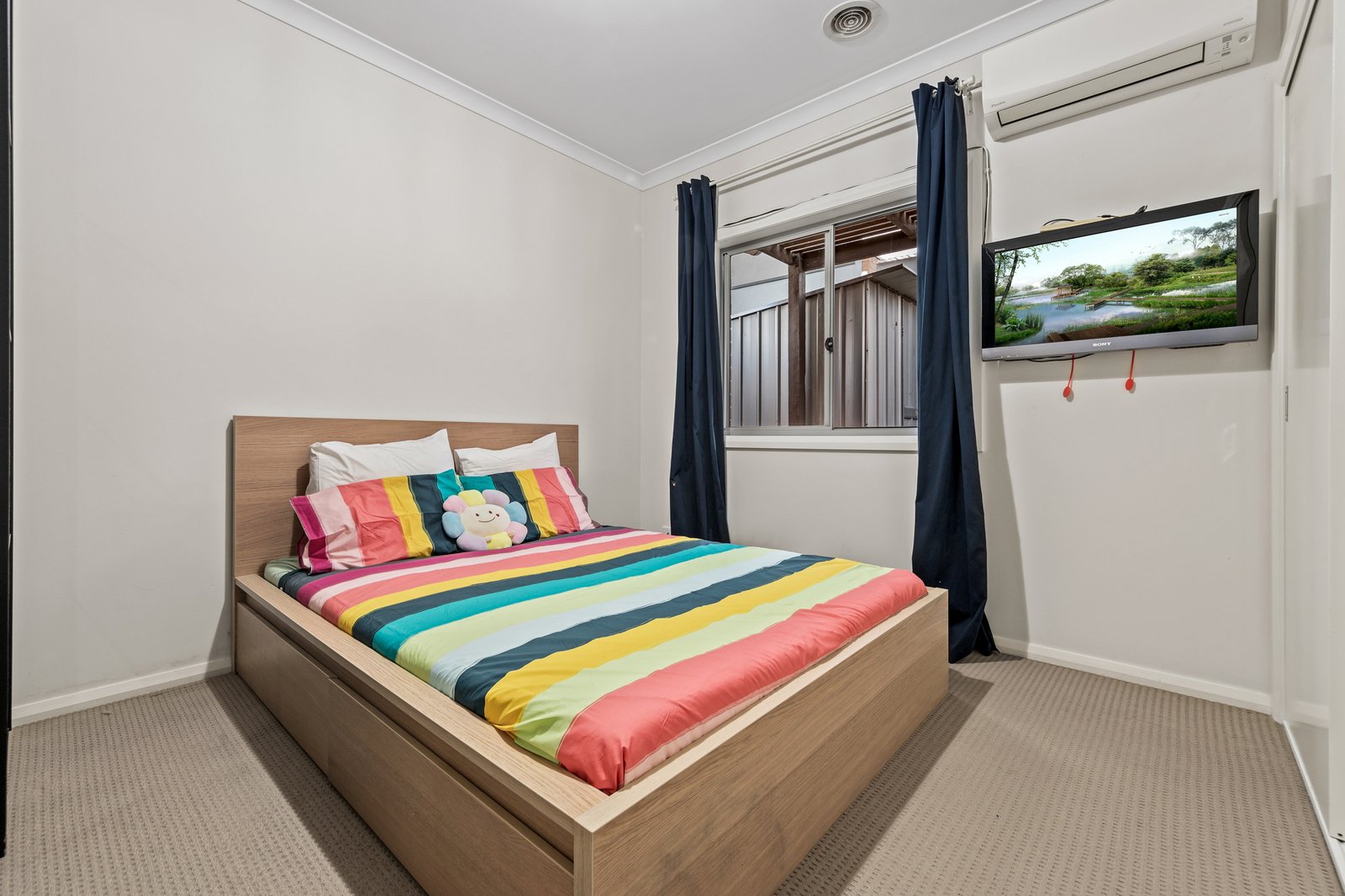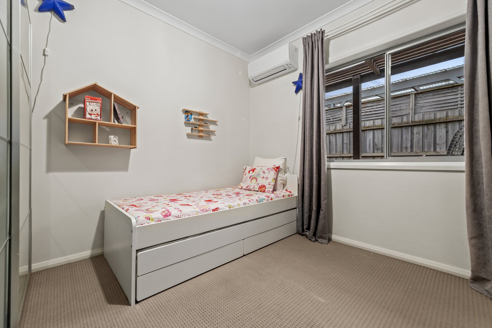Two well-sized bedrooms, each with built-in robes, are serviced by a central bathroom, a separate powder room, and a clever European laundry. Enhanced by high ceilings, LED downlights, and three reverse-cycle air conditioners, the home ensures year-round comfort. Security features include an alarm system and CCTV, while the unit's private position adds an extra layer of peace of mind.