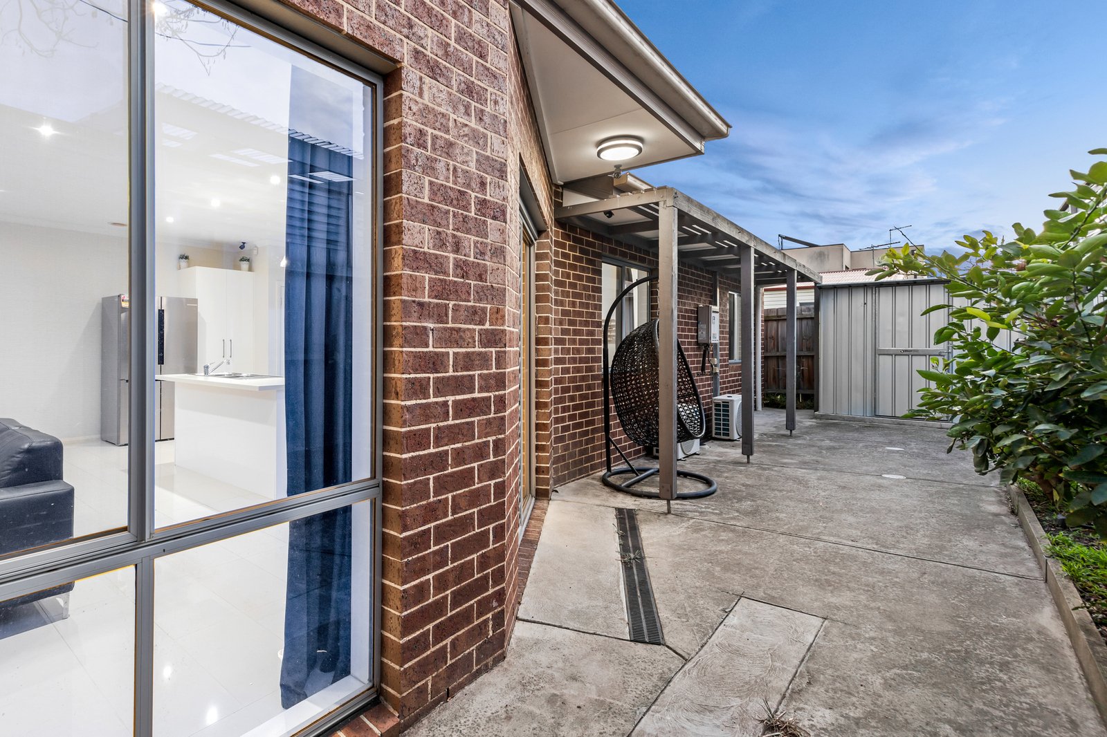 Outside, a north-facing courtyard invites relaxed outdoor living with a rear verandah, a paved patio, a storage shed, and a roller-door-accessed single carport for secure off-street parking.