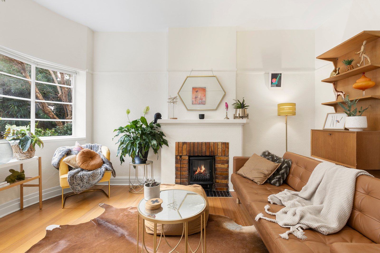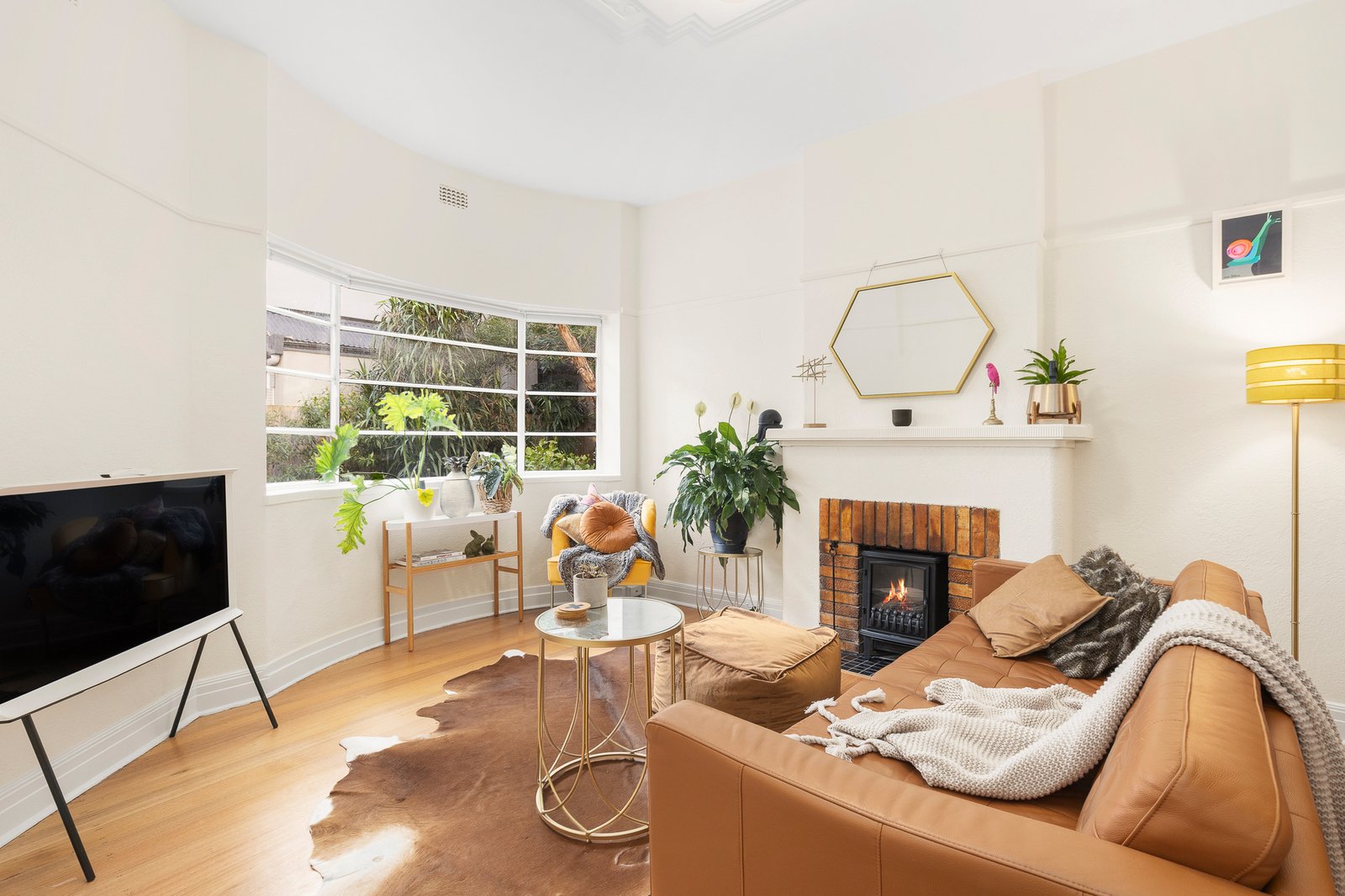 Set quietly at the rear of the block with its own secure, rear-accessed undercover car space, the home immediately impresses with a warm and inviting living area, centred around a traditional fireplace with electric heater and framed by a signature curved Art Deco window.