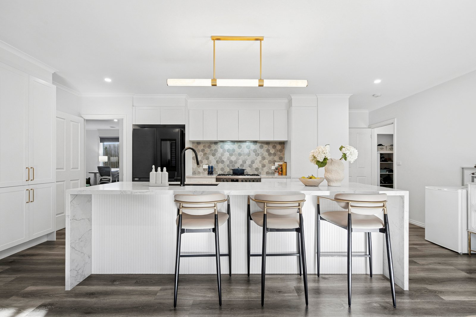 The traditional façade is set amongst landscaped gardens, with an elevated sun deck offering the perfect platform to take in the picturesque surrounds. Inside, a wide entry hall showcases crisp white interiors, modern flooring, elevated ceilings and feature pendant lighting, introducing the chic contemporary theme within. An inviting living area features a gas log fire, providing an ambient space to retreat or entertain. The adjoining kitchen and dining space enjoys north facing natural light, offering a light filled heart of the home to gather with the family. The stunning kitchen features a large island with waterfall stone benchtops, quality appliances including 900mm oven and cooktop, dishwasher, beautiful feature-tile splashback, ample storage and stunning pendant lighting. Centrally positioned to overlook the living, dining and alfresco areas, entertainers will love the layout of this space.