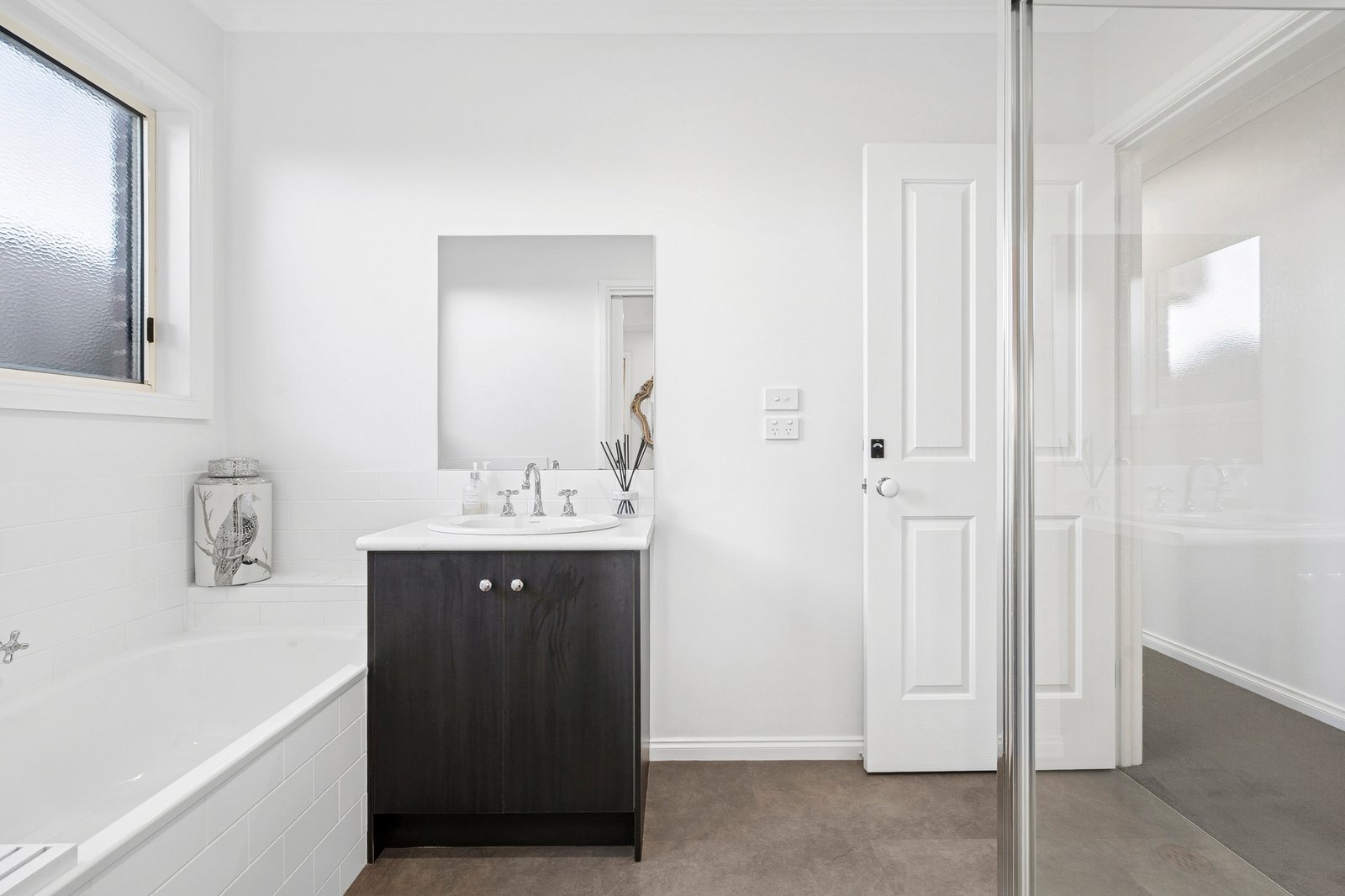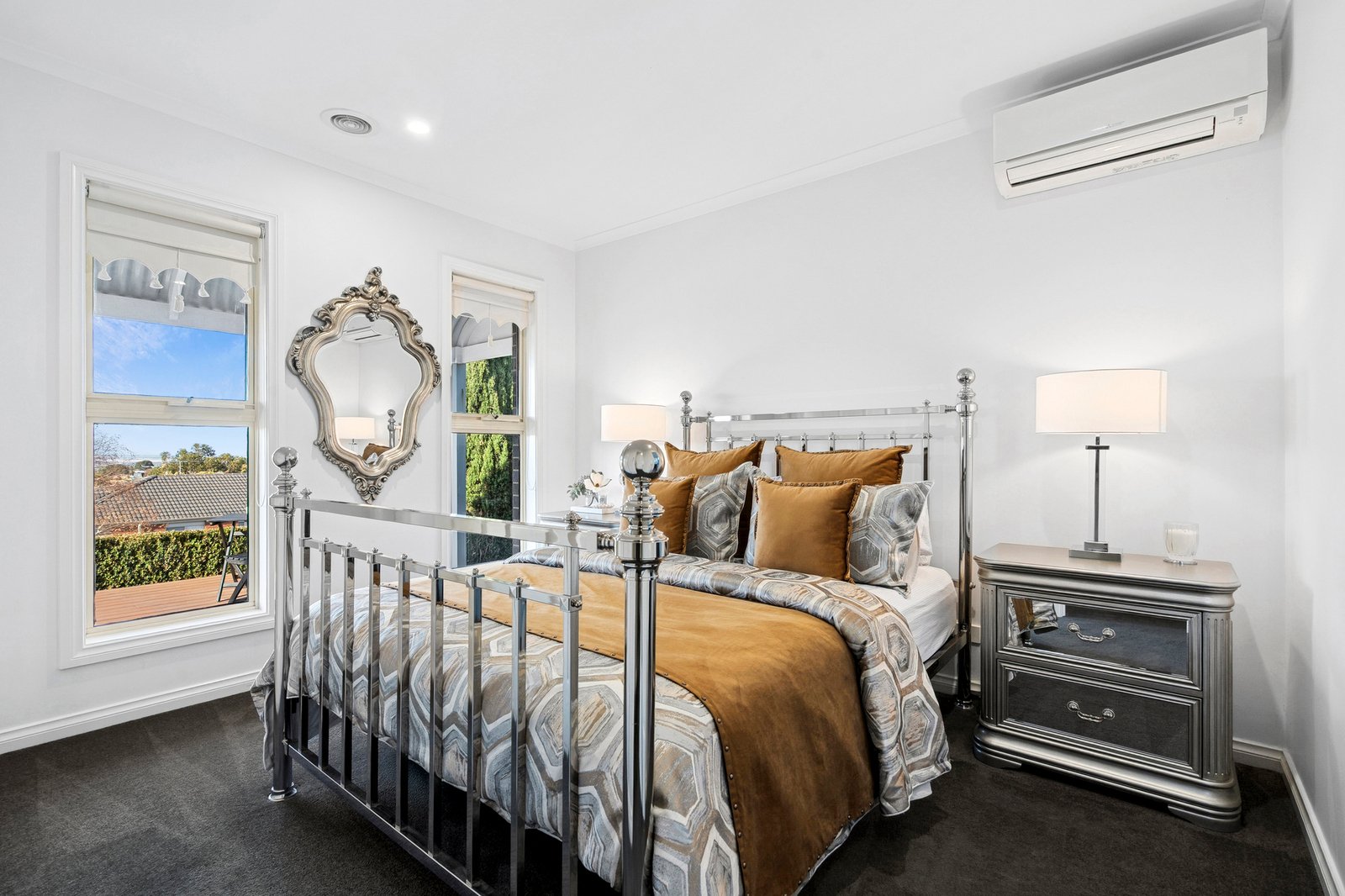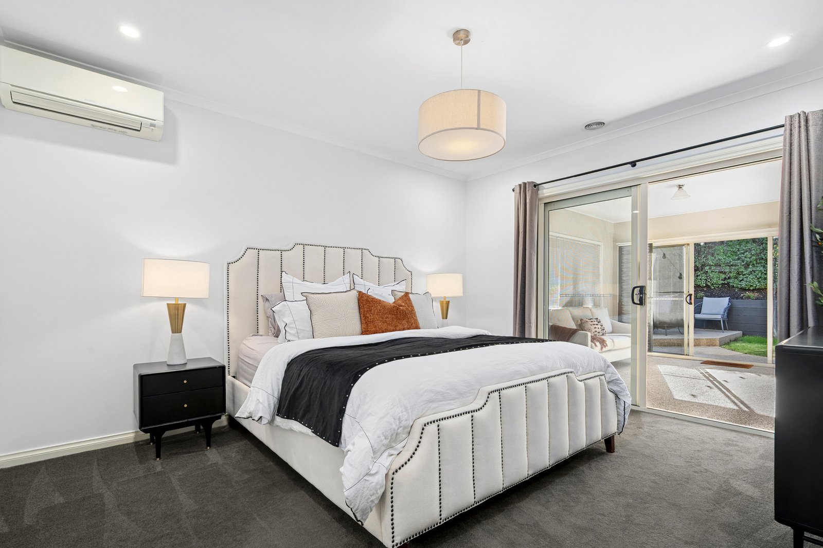 The main bedroom is privately zoned at the rear of the home, featuring walk-in robes, a tastefully presented ensuite, and direct access to a north facing sunroom. Three additional bedrooms in a separate wing all include built-in robes, accompanied by a contemporary main bathroom, separate powder room, and a study providing a quiet space to work from home. All bedrooms include individual split system heating and cooling for personalised climate control.