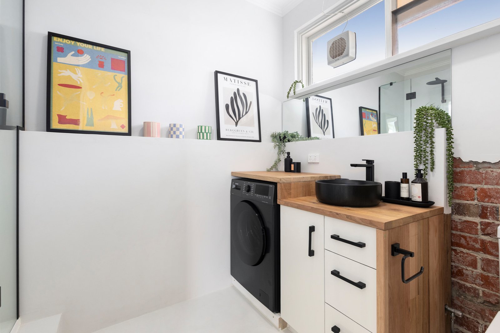 Both bedrooms are generously sized, each with built-in robes, and the sleek, modern bathroom, with room for a washing machine, completes the home’s sense of refinement.