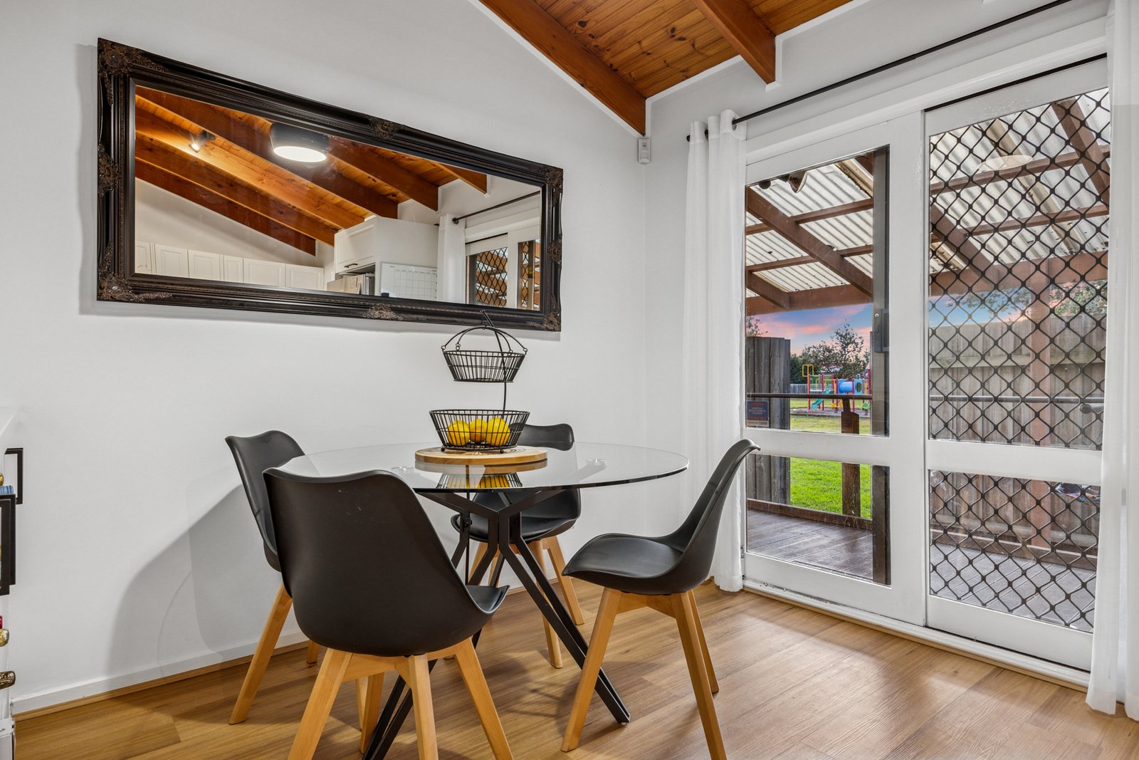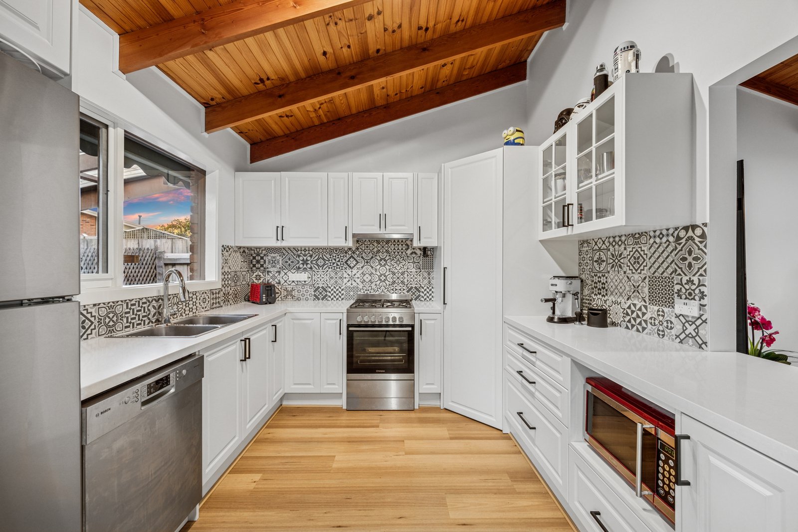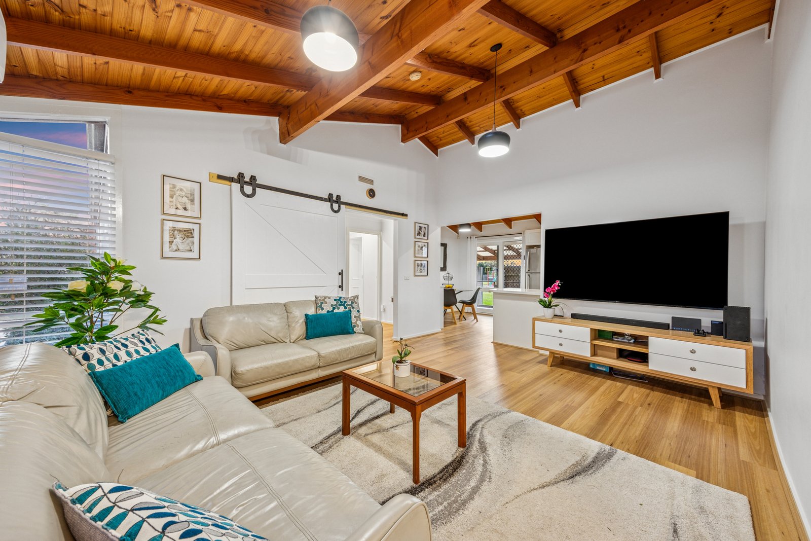 Slide off the main road onto this sheltered service lane, follow this wide driveway to right to the rear...then open up this exciting surprise package! Sizeable, stylish and so serenely positioned to the rear, this family-size four bedroom, two bathroom home is set to surprise with free-flowing living beneath a soaring vaulted-ceiling, a lawned and paved wraparound garden with all-weather entertaining, and the biggest surprise of all...a secure gate to a ‘secret’ park known only to a handful of locals!