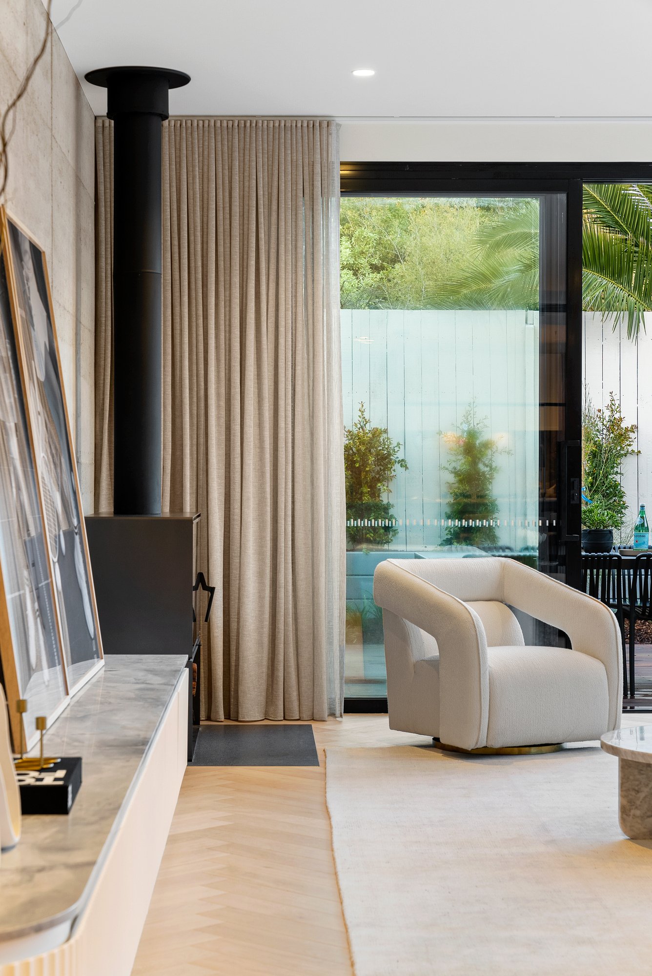 The ground floor unfolds with quiet drama. A broad entrance hall reveals a storage-rich laundry, custom wine display, sleek powder room, and an alternative main bedroom with walk-in robe and indulgent ensuite. At the rear, the expansive open plan living and dining zone rises beneath lofty ceilings, adorned with bespoke cabinetry and anchored by a wood fire heater - where connection and comfort intertwine.