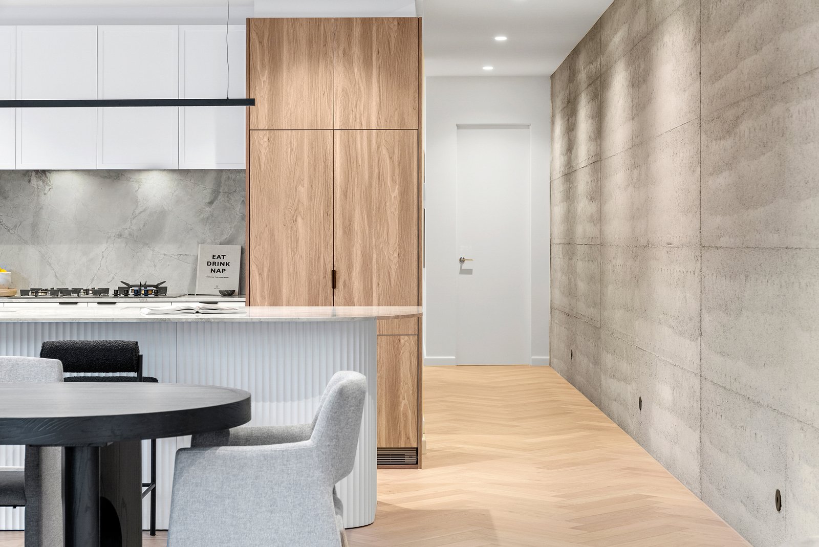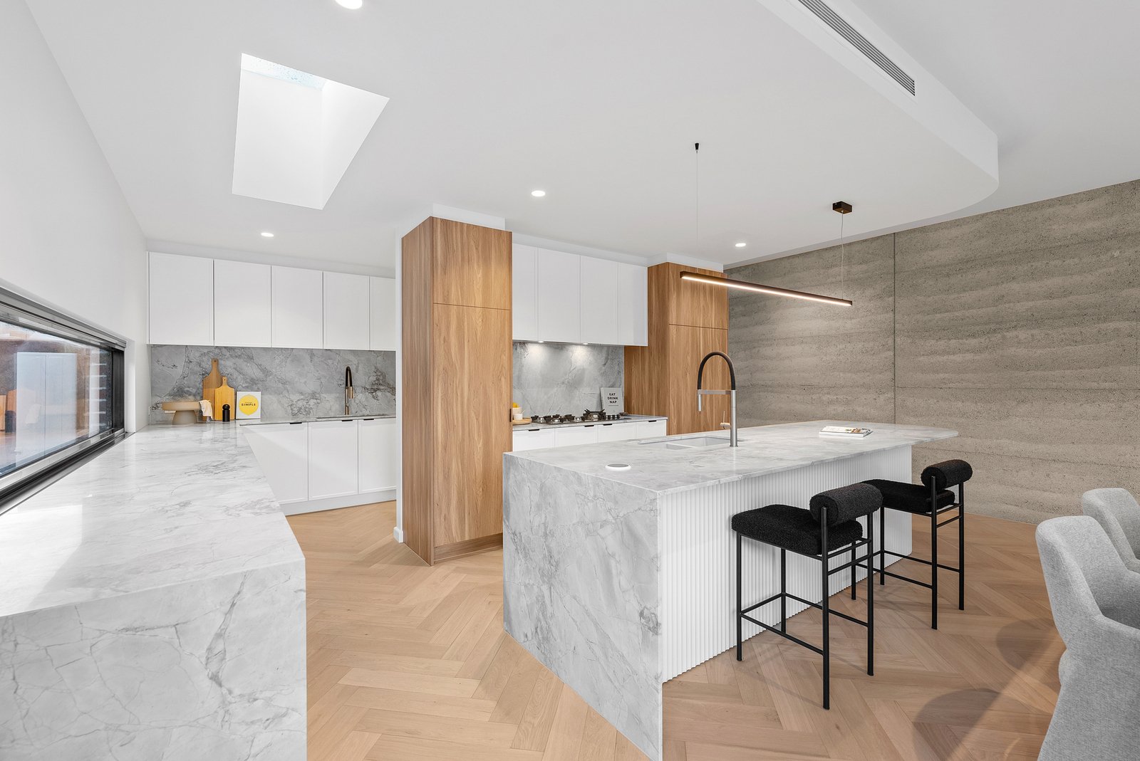 Beyond remote-controlled gates and a high brick wall, the dynamic facade reveals architectural intent and quiet refinement. A vast front door opens to soaring ceilings, a rammed earth wall spanning all levels, and radiant expanses where natural elements and considered textures converge. Skylights warm Sandy Beach herringbone parquetry, accentuating refined form and thoughtful detail.
