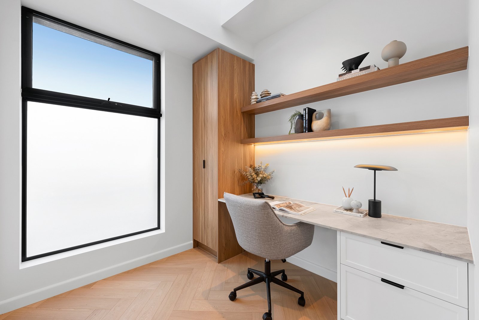 Upstairs, the master suite is positioned for serenity - a private haven featuring a designer dressing room, sumptuous twin-vanity ensuite with freestanding bath, and flowing sheers framing a secluded balcony with leafy treetop outlooks. Two additional bedrooms, each appointed with generous robes, share a fully tiled family bathroom, while a sun-drenched retreat and fitted study nook contribute to a refined sense of liveability.