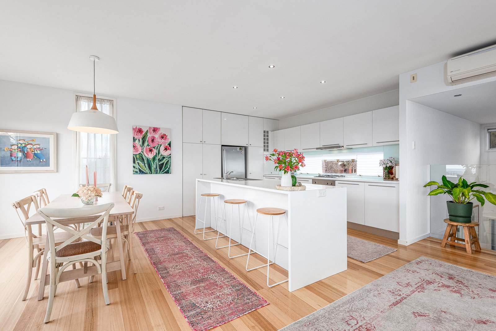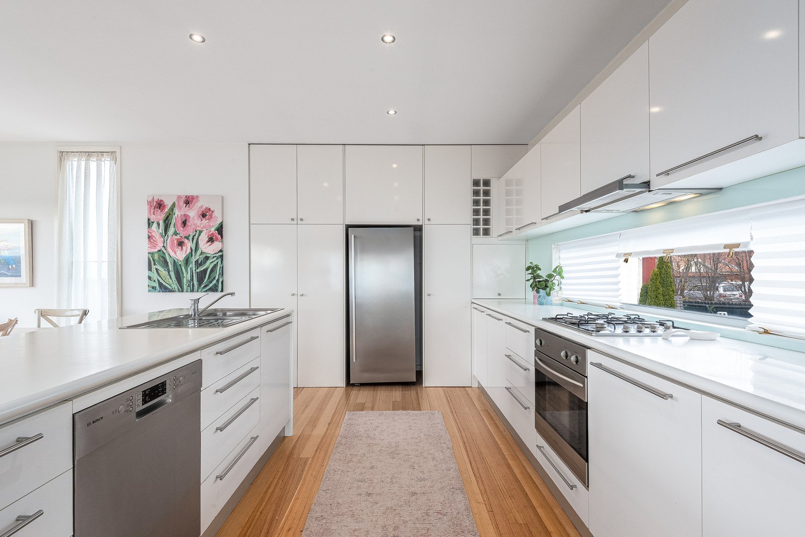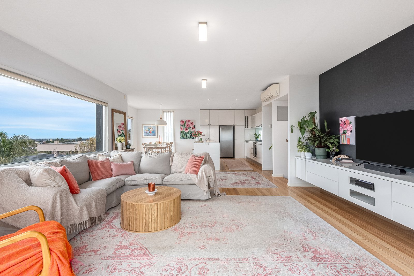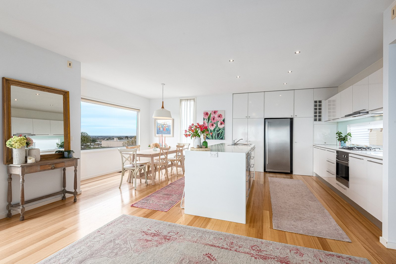 The split-level design ascends to the light-filled main living area, featuring spectacular picture windows framing panoramic views. The elegant kitchen features quality stainless steel appliances including 600mm oven, gas cooktop, Bosch dishwasher, and generous storage provisions. The open plan layout connects effortlessly with the dining area and living room, which opens up to a large balcony, completing an impressive indoor-outdoor entertaining space.