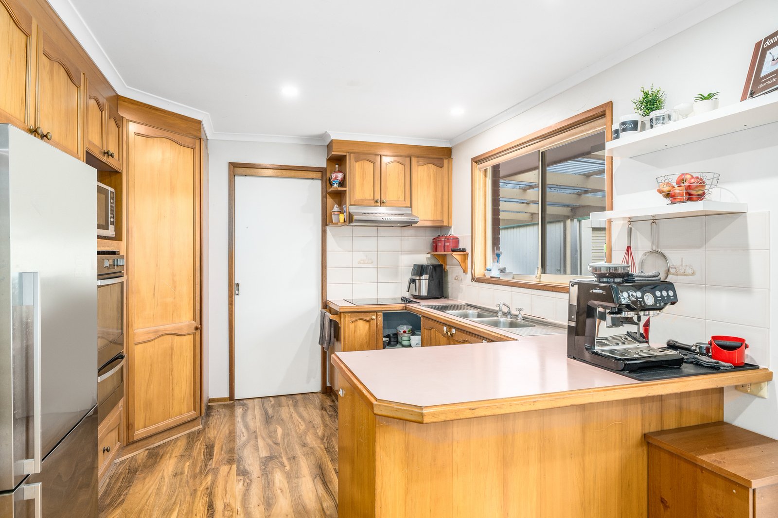 - Timber kitchen, wall oven, electric cooktop & corner pantry