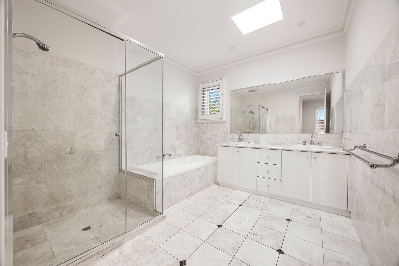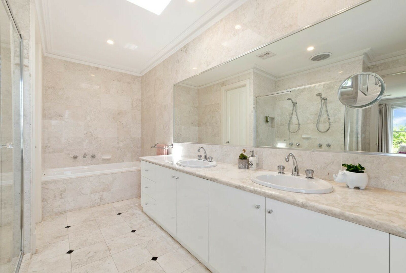 Cleverly zoned, all bedrooms are located upstairs - extensively robed and oversized - and serviced by a skylit bathroom with bath, twin vanity, and walk-in shower. The luxe, marble-finished main bedroom boasts a north-facing balcony, walk-in robes, and a twin-vanity ensuite with bath, private WC and dual shower.