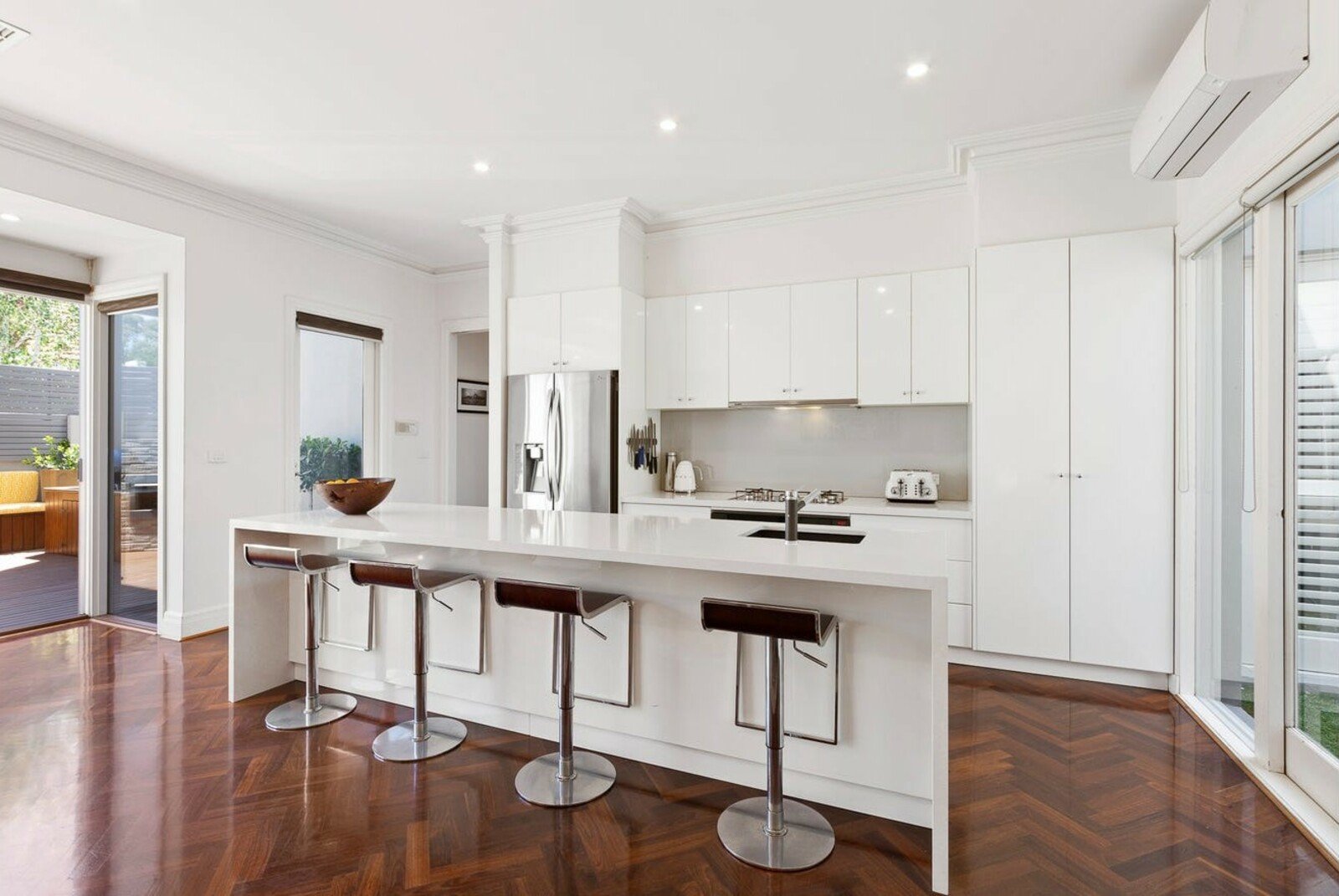The formal lounge, with built-in cabinetry, and light filled dining room radiate a feeling of warmth and inclusion before opening up to a spacious and relaxed living/dining area. The crisp white kitchen showcases a stone-finished island bench with top of the range appliances. OFP NON OPERATIONAL