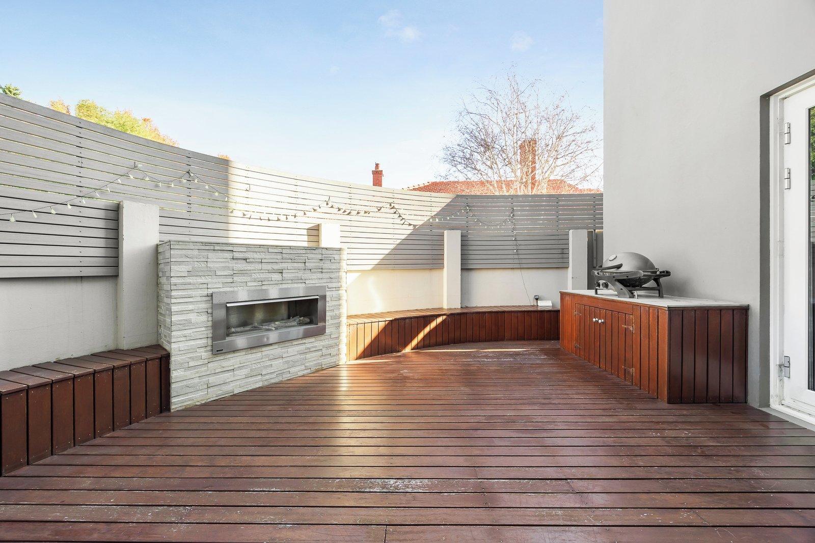 Step out onto the timber-topped alfresco deck with a range of enticing features. Screened for privacy and featuring a remote-controlled outdoor awning providing shelter and shade, enjoy bench seating positioned around the BBQ area.